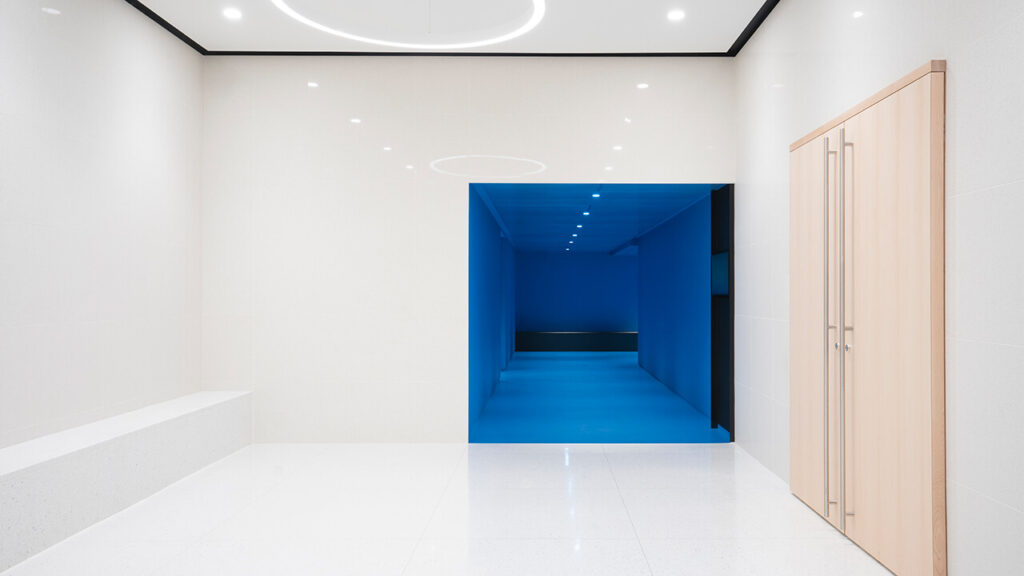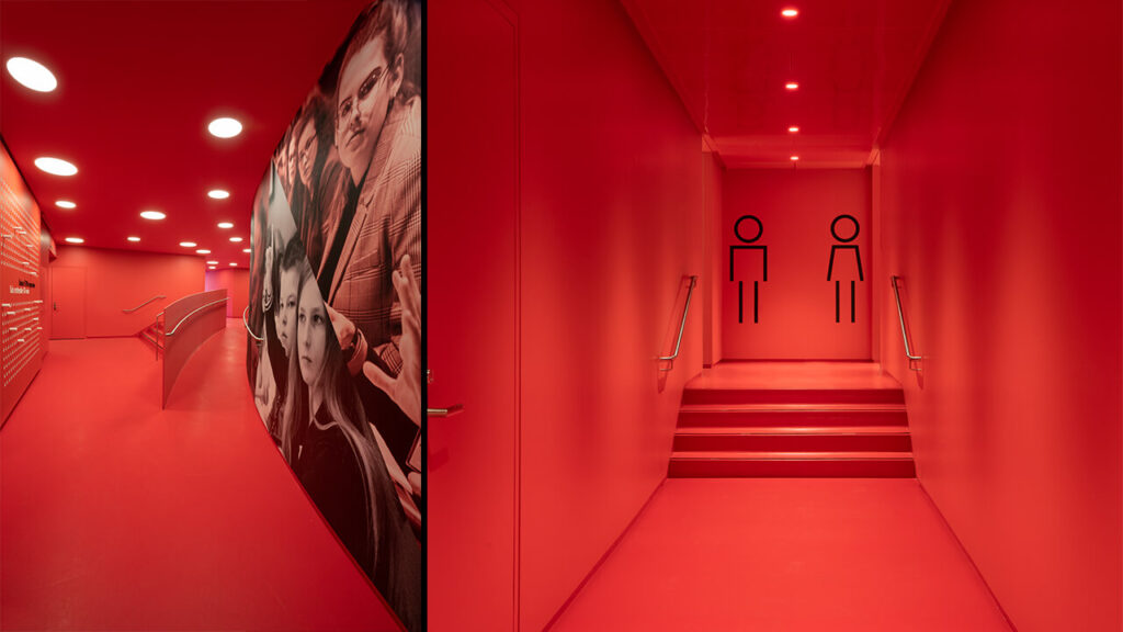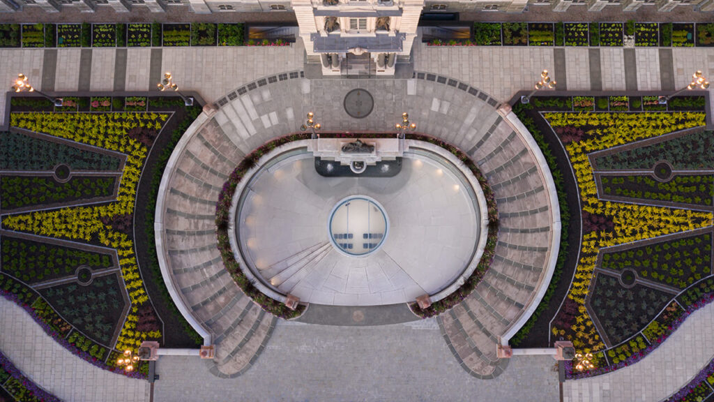 La maçonnerie de l’escalier aura été démontée pièce par pièce, entreposée puis reconstruite à l’identique, alors qu’une excavation profonde aura été pratiquée jusqu’aux fondations de l’édifice afin d’y installer les nouveaux programmes – une intervention audacieuse permise par la solidité des constructions datant de 1886 et leur implantation sur un terrain en roc. Les travaux achevés, la façade historique reste visible sur toute sa hauteur, et conserve des liens directs vers les jardins. À ses pieds, le déploiement de vitrages de part et d’autre d’un oculus signale l’intervention, de manière plus soutenue lors de leur illumination à la tombée du jour. Le visiteur est ainsi invité à s’approcher au plus près de l’édifice patrimonial, avant de se glisser sous ses murs.