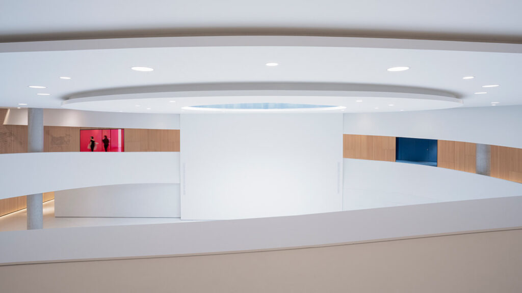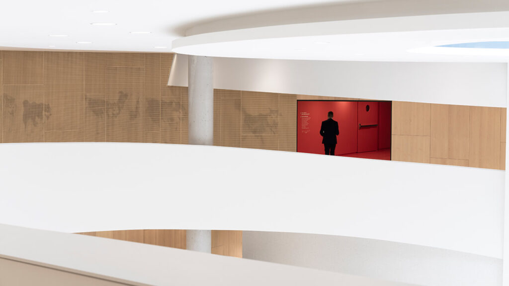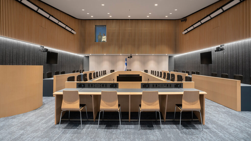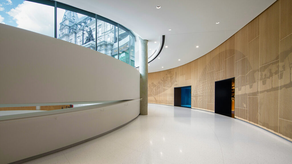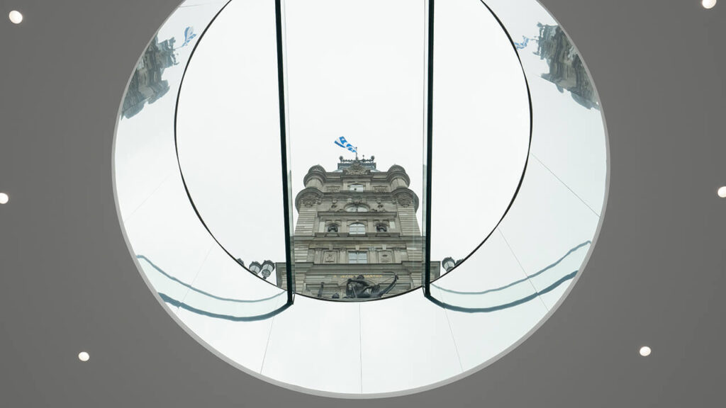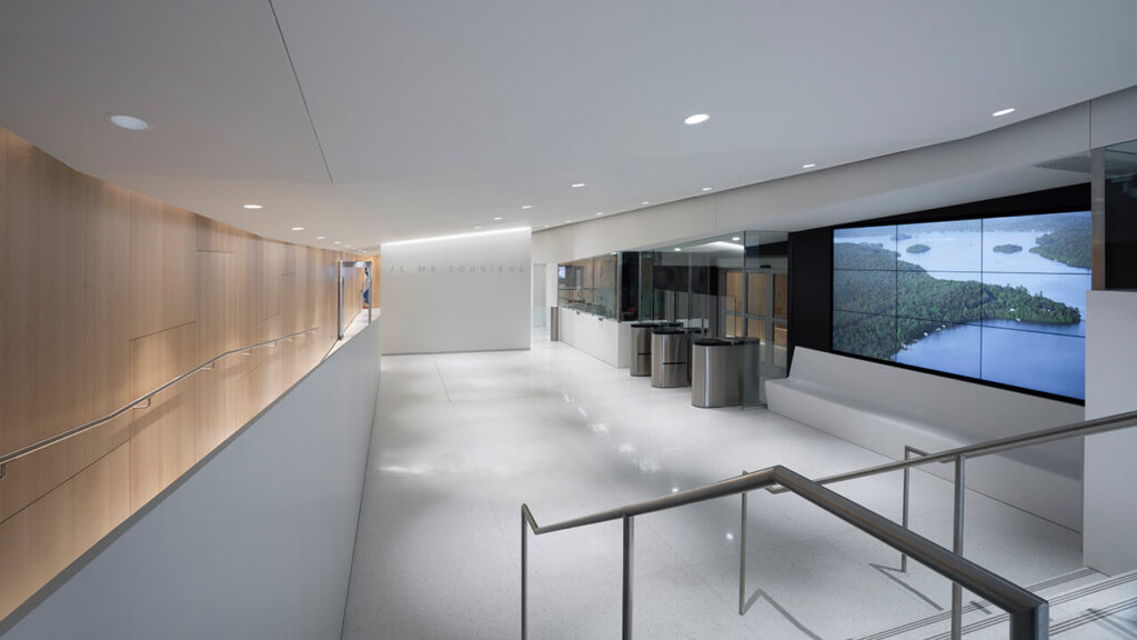 Avec sa rampe circulaire universelle et son oculus présentant une vue sur la tour centrale de l’Assemblée nationale, cette modernisation de Provencher_Roy démontre une réflexion aboutie sur la symbolique du mandat. De plus, nous apprécions l’intégration d’une fresque murale, qui raconte l’histoire du Québec sur les parois extérieures de la rampe centrale, camouflant habilement les systèmes électromécaniques.