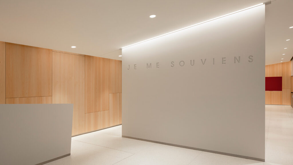 Entièrement développé sous terre, le projet se libère de toute contrainte formelle pour mettre l’accent sur l’expérience de l’espace. Celle-ci s’articule autour d’une rampe spiralée accessible directement depuis l’entrée, et décrivant un parcours scénographique à travers l’histoire québécoise. Une fresque en reprend les grandes étapes via une série d’images évocatrices des notions de collectivité et de citoyenneté. Ces images, véritables sculptures de lumière, apparaissent en filigrane grâce à l’éclairage de panneaux perforés en différentes profondeurs. La rampe, ainsi que les panneaux périphériques, jouent en outre un rôle technique : la première en agissant en tant que pivot structurel ; les seconds en dissimulant les réseaux et en permettant la circulation de l’air via les perforations les plus profondes.