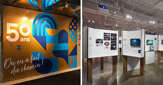 Le prestigieux Gutenberg était pour le projet Murale 50e pour Loto-Québec. Ce projet consistait à imprimer une murale de 185 po X 126 po sur divers matériaux. La murale devait être conçue pour pouvoir « révéler » différentes informations pendant plusieurs mois, tout en demeurant parfaitement intacte. Une première impression « couche » pleine grandeur, montrant des graphiques et des photos, se cachait derrière une seconde impression « couche » et dévoilée par section tout au long de l’année. Une deuxième couche amovible, devait se fondre parfaitement à la première, tout en pouvant se détacher sans laisser de trace. Des effets 3D sur certains textes et images étaient utilisés soigneusement.