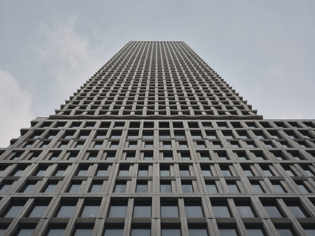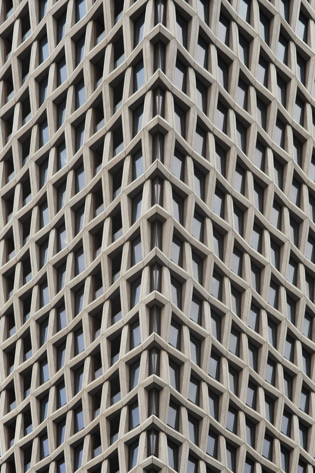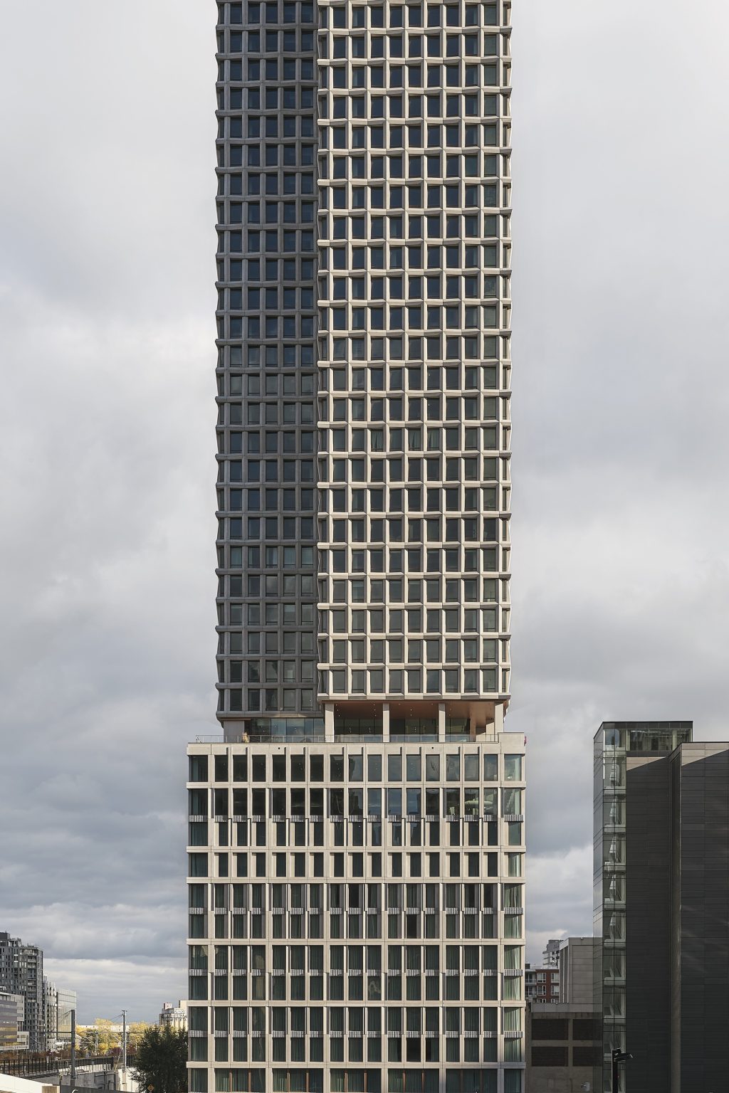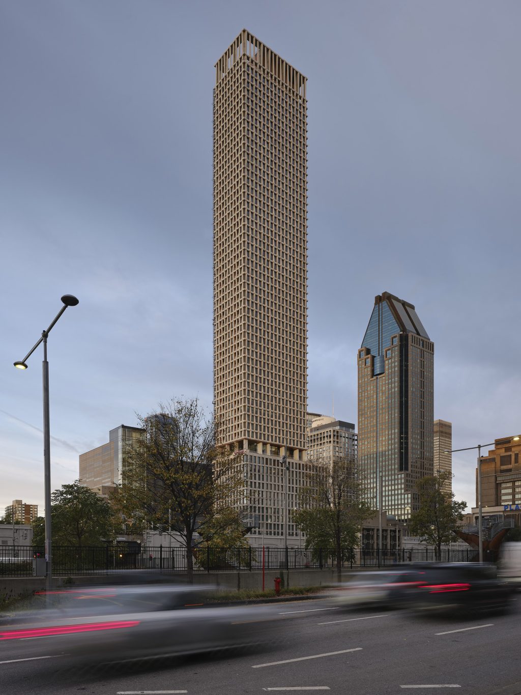 L’enveloppe minérale de la tour renoue avec le grain caractéristique de Montréal qui transparaît dans l’héritage architectural du Vieux-Montréal, de la Place Ville-Marie, de l’édifice Sun Life et du Parc Olympique, entre autres. Grâce à un assemblage de panneaux en béton préfabriqué sculpté qui rappelle l’entrelacement de fils tissés et de motifs cruciformes emblématiques, la tour frappe l’œil dans un horizon où le verre prédomine. La conception insuffle au bâtiment d’une hauteur de 200 mètres un aspect de légèreté, alors que l’orientation solaire fait apparaître les variations de relief qui marquent la façade. Des volumes transparents et ouverts parsèment aussi l’enveloppe de zones lumineuses à des endroits stratégiques, rendant visible depuis l’extérieur la vie sociale qui anime le bâtiment.