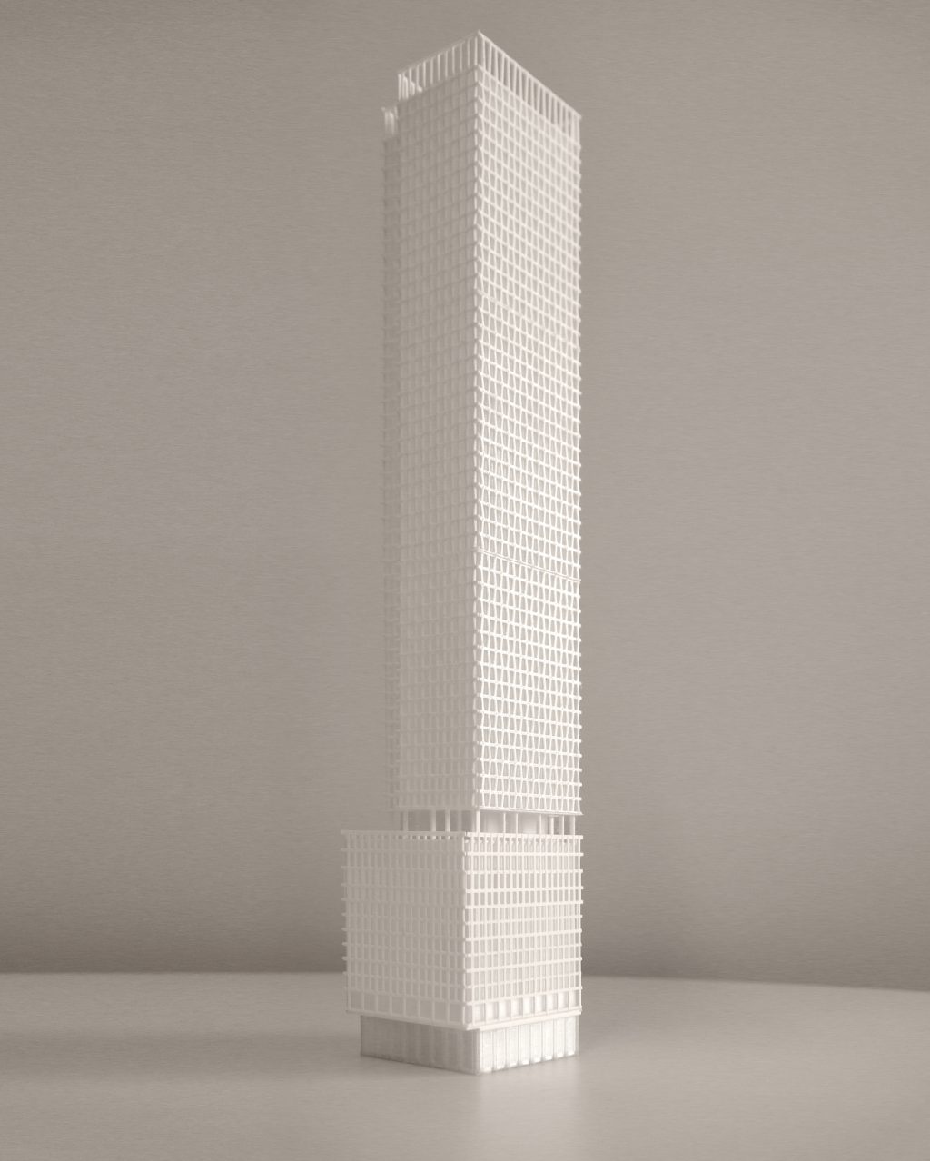 La tour se scinde en trois strates : un basilaire, une tour et un couronnement. Chaque partie est travaillée distinctement et est associée à un espace vert dialoguant avec une échelle différente de la ville. Au sol, l’enveloppe est très transparente, et un jardin lié à la terrasse du restaurant et à la piste cyclable participe au verdissement du secteur en continuité avec le PPU du Quartier des Gares. Sur le basilaire, les panneaux de béton revêtent une texture fine de motifs en bas-relief, et des terrasses plantées forment un jardin suspendu qui s’adresse au quartier en créant une rupture visible entre le socle et la tour. Enfin, au sommet, derrière des panneaux aux ouvertures surdimensionnées, un espace vert s’ouvre vers le Mont-Royal, que la tour rejoint en altitude.
