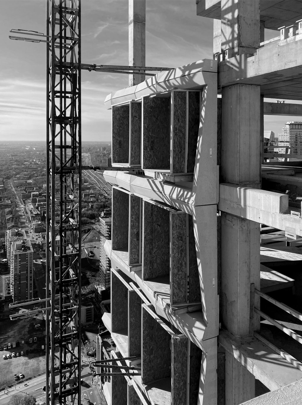 Récipiendaire d’un prix d’excellence aux Canadian Architect Awards 2025, le 900 Saint-Jacques est porteur d’une qualité architecturale dont l’exceptionnalité est saluée par le milieu et met au premier plan une utilisation du béton qui allie audace et expertise. Dans un contexte où les tours d’habitation sont majoritairement conçues en verre, le 900 Saint-Jacques affirme une présence contemporaine qui renoue avec la matérialité minérale typique de Montréal. Son enveloppe singulière en panneaux en béton préfabriqués aux lignes irrégulières génère un effet de tissage impressionnant.