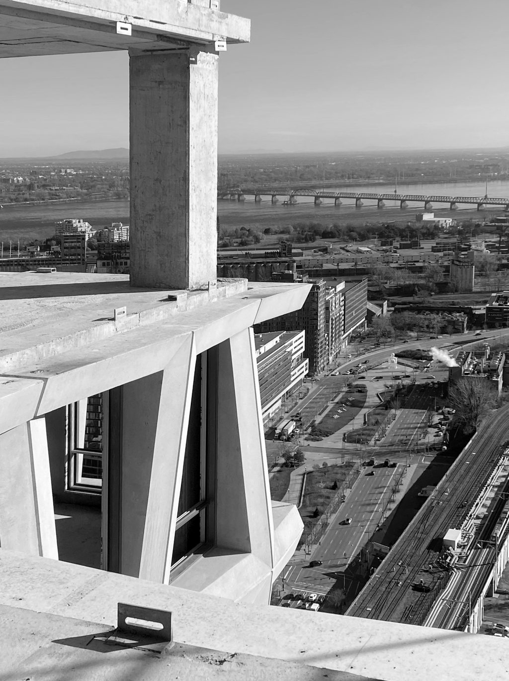 Au cœur du Quartier des Gares, la tour du 900 Saint-Jacques offre une réponse contextuelle aux enjeux actuels en matière d’habitation en milieu urbain dense. S’implantant sur un site historiquement perçu comme un espace résiduel en marge du centre-ville, la tour de 63 étages érige un microcosme habitable dans une zone occupée par les voies ferrées et l’autoroute Ville-Marie, réunissant 4 étages de stationnements souterrains, un hôtel de 12 étages, 700 logements locatifs répartis sur 48 étages et des espaces de socialisation. Alors que Montréal cherche à concilier héritage bâti, pression immobilière et transition écologique, le 900 Saint-Jacques exemplifie la possibilité de construire une tour d’habitation qui dialogue avec la ville d’hier, les infrastructures d’aujourd’hui et les modes de vie de demain.