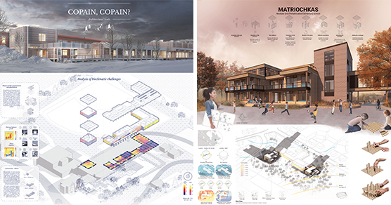 « Des étudiants de l’École d’architecture de l’Université Laval se distinguent au concours organisé par l’American Institute of Architects Committee on the Environment (AIA COTE) en partenariat avec l’ACSA (Association of Collegiate Schools of Architecture). Le concours récompense dix projets d’atelier de design qui exploitent des concepts de carboneutralité grâce à l’intégration créative et innovante de stratégies de design telles que l’éclairage naturel, le chauffage et le refroidissement passifs, les matériaux écologiques, la gestion de l’eau, et la gestion durable de l’énergie.