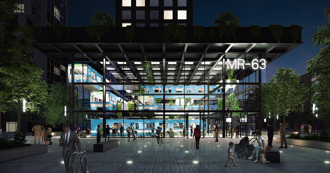 « Montréal, 2 juin 2023 | MR-63 est sur les rails plus que jamais. La construction de ce futur pavillon culturel débutera dès 2024. Ce projet incluant l’espace sur lequel il sera aménagé totalisera une valeur de 28.8 millions$. Il est piloté par les frères Frédéric et Etienne Morin-Bordeleau et prendra place dans le quartier Griffintown sur la Place William Dow, au coin des rues Peel et Ottawa, afin d’y apporter un renouveau culturel nécessaire.