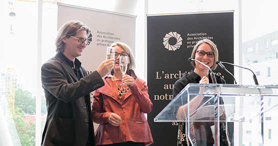 C’est à la Maison des étudiants de l’ÉTS, nouvel espace ouvert et baigné de lumière, qu’Anne Carrier, présidente de l’AAPPQ, a souligné le chemin parcouru par l’Association depuis sa création en 1977, et a rendu hommage aux anciens président(e)s, membres des conseils d’administration et personnel de l’Association. C’est aussi le regard tourné vers l’avenir que la présidente a souhaité transmettre un message aux invités présents. « Même si les défis restent importants pour promouvoir la qualité architecturale, nous n’avons jamais autant parlé d’architecture et de design au Québec, que ce soit dans les médias ou dans l’espace public, c’est porteur d’espoir », a-t-elle déclaré avant de formuler ses voeux d’améliorer le rapport de notre société à l’architecture.