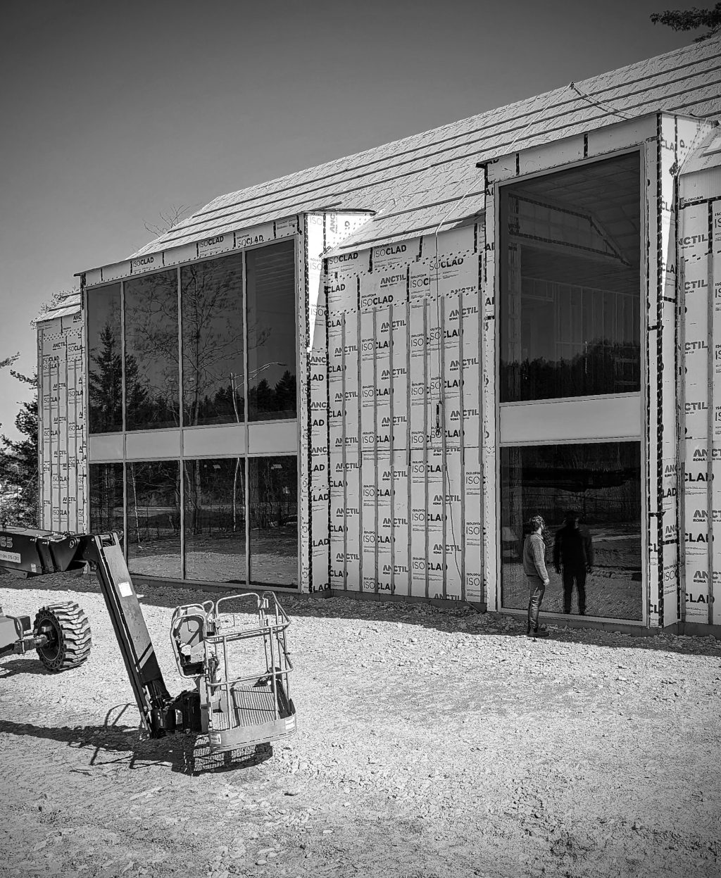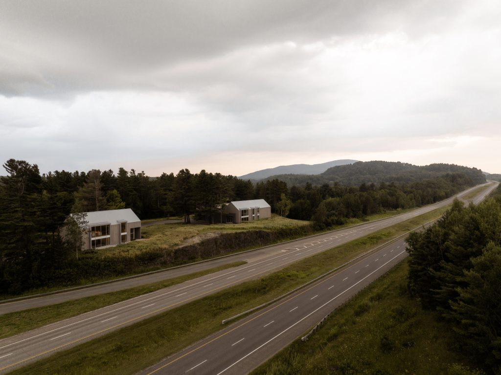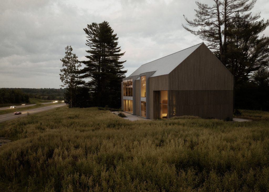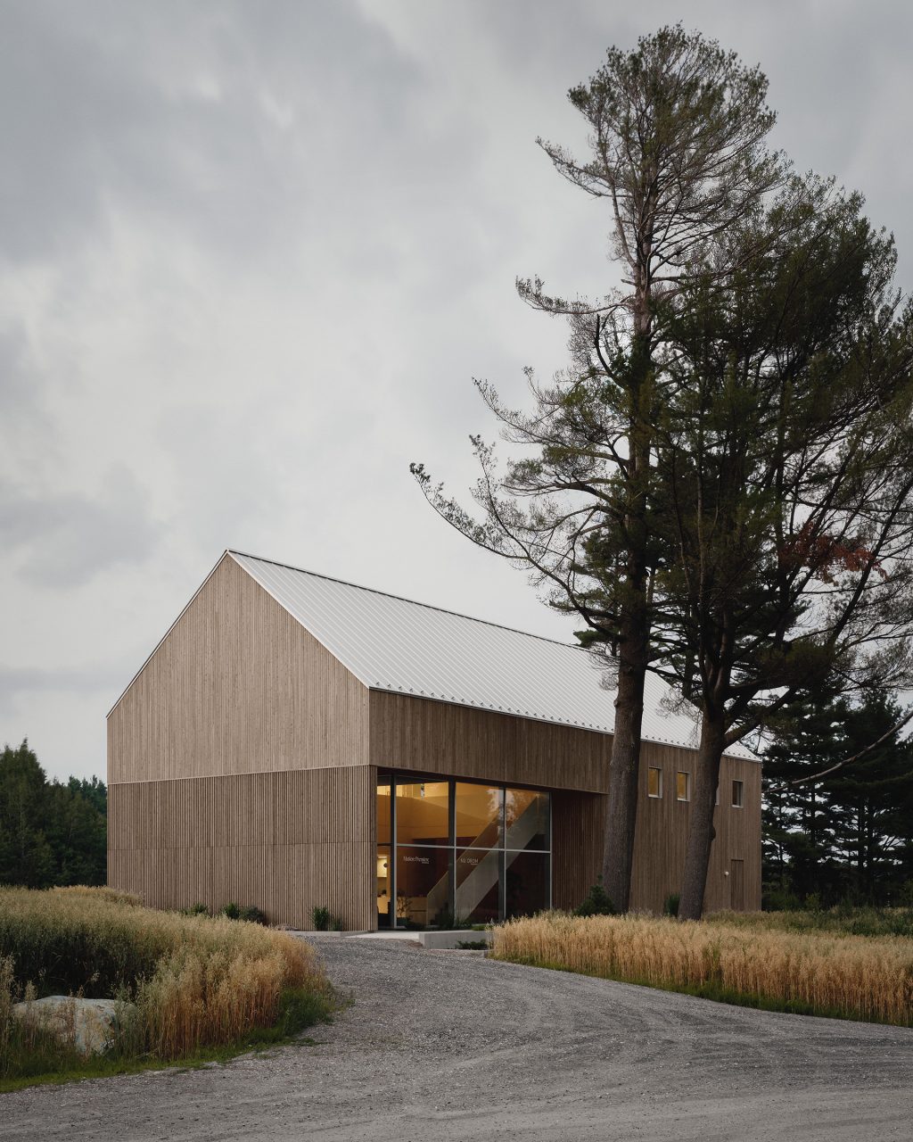 Matière Première Architecture est une firme d’architecture située dans les Cantons-de-l’Est au Québec. Elle travaille, depuis 2016, en étroite collaboration avec sa compagnie sœur, Nu Drom, une entreprise de construction. Depuis plusieurs années, les deux équipes cherchaient un lieu où établir durablement leur identité commune. L’occasion d’acquérir un terrain à l’entrée de Magog, conjointement avec un partenaire issu du milieu de l’ébénisterie, a marqué le point de départ d’un projet fondateur. Deux bâtiments ont ainsi été conçus par Matière Première Architecture et construits de manière simultanée : l’un dédié aux activités de production, l’autre pensé comme un espace de travail, de réflexion et de diffusion. Bien que le présent article mette en lumière le bâtiment de bureaux, l’ensemble du site a été pensé comme un tout cohérent, tant dans sa matérialité que dans son implantation.