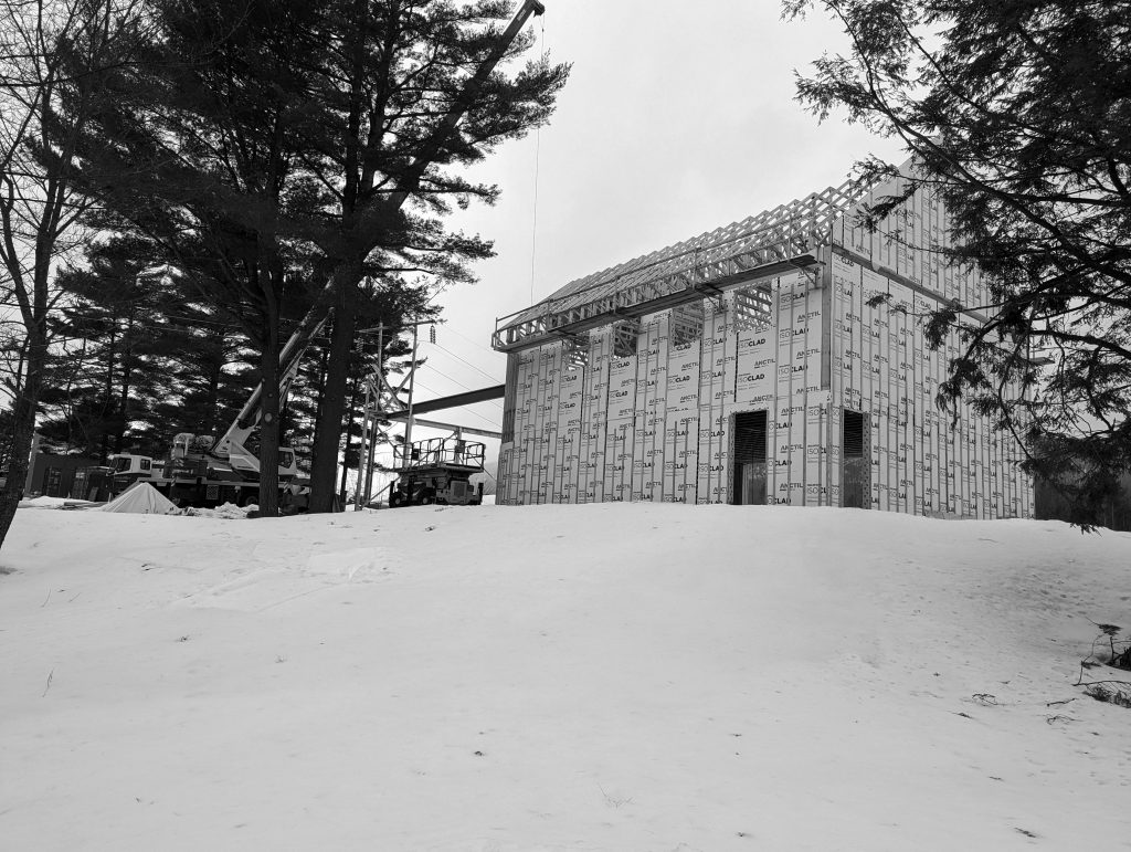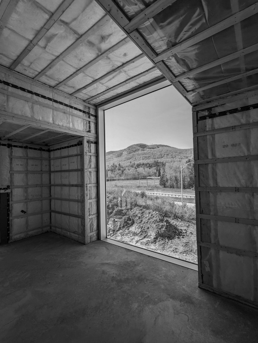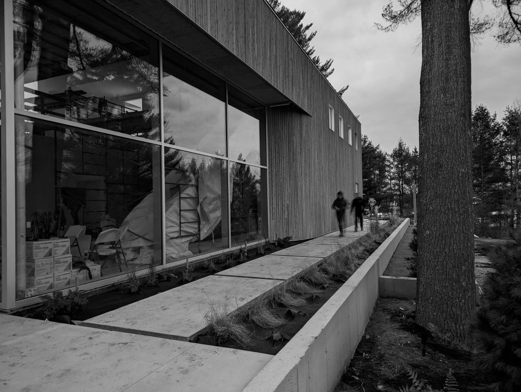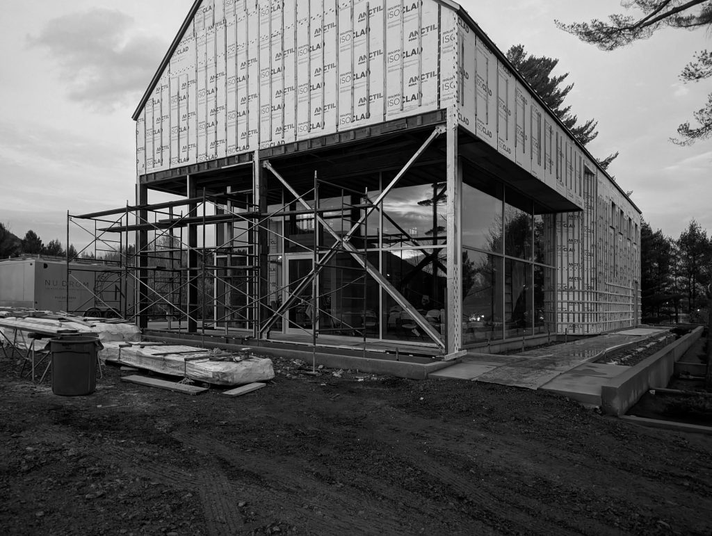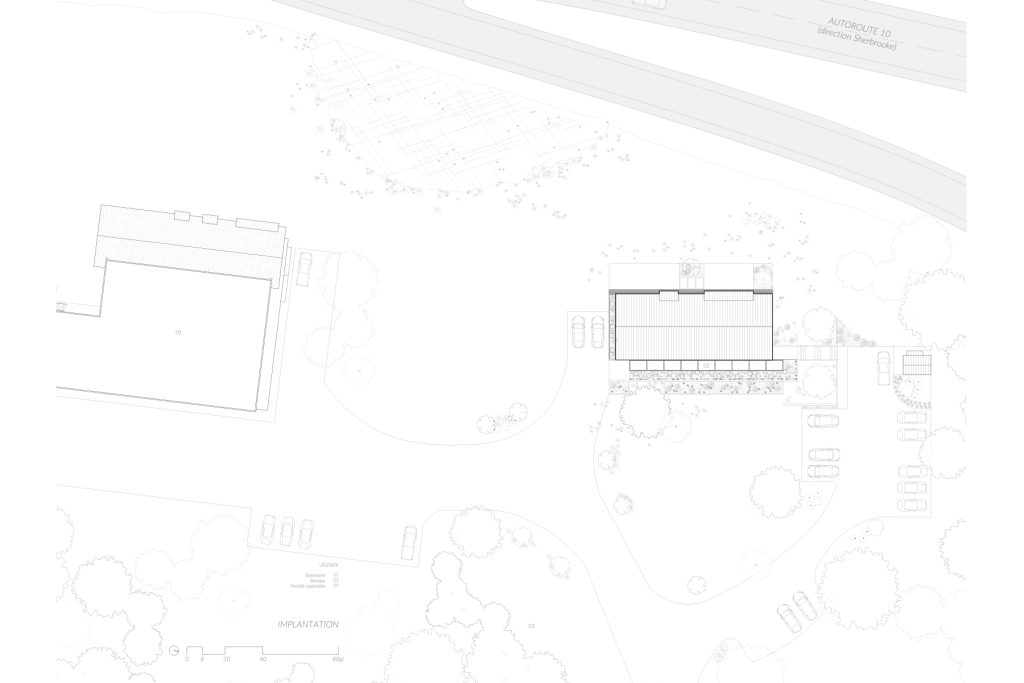 Matière Première Architecture est une firme d’architecture située dans les Cantons-de-l’Est au Québec. Elle travaille, depuis 2016, en étroite collaboration avec sa compagnie sœur, Nu Drom, une entreprise de construction. Depuis plusieurs années, les deux équipes cherchaient un lieu où établir durablement leur identité commune. L’occasion d’acquérir un terrain à l’entrée de Magog, conjointement avec un partenaire issu du milieu de l’ébénisterie, a marqué le point de départ d’un projet fondateur. Deux bâtiments ont ainsi été conçus par Matière Première Architecture et construits de manière simultanée : l’un dédié aux activités de production, l’autre pensé comme un espace de travail, de réflexion et de diffusion. Bien que le présent article mette en lumière le bâtiment de bureaux, l’ensemble du site a été pensé comme un tout cohérent, tant dans sa matérialité que dans son implantation.