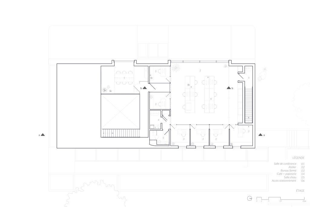 L’aménagement intérieur privilégie la flexibilité, anticipant les besoins futurs tout en limitant l’impact environnemental. Ainsi, le rez-de-chaussée abritant une salle d’exposition actuelle pourra évoluer en bureaux supplémentaires sans nécessiter de lourds travaux.