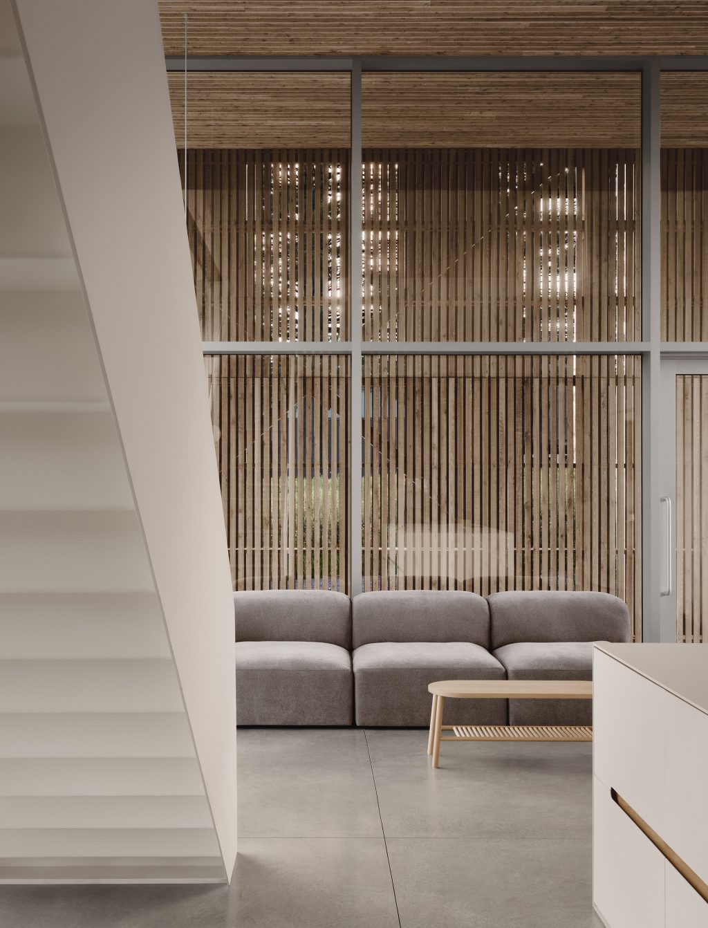 Le confort thermique et lumineux a guidé les choix d’implantation et de composition dès les premières esquisses. Les façades vitrées, orientées de manière stratégique, permettent de réguler naturellement la température intérieure tout en maximisant l’apport en lumière naturelle. Sur le mur sud, la façade vitrée est intentionnellement en retrait par rapport à l’enveloppe principale, créant une zone tampon qui limite les gains solaires estivaux tout en favorisant les apports passifs hivernaux. Du côté ouest, un claustra extérieur en bois filtre les rayons rasants de fin de journée, assurant un confort visuel sans compromettre la relation avec le paysage. Cette intégration harmonieuse de principes passifs contribue à créer des environnements à la fois confortables et inspirants. La lumière naturelle agit ici comme un matériau vivant, essentiel dans notre démarche architecturale.