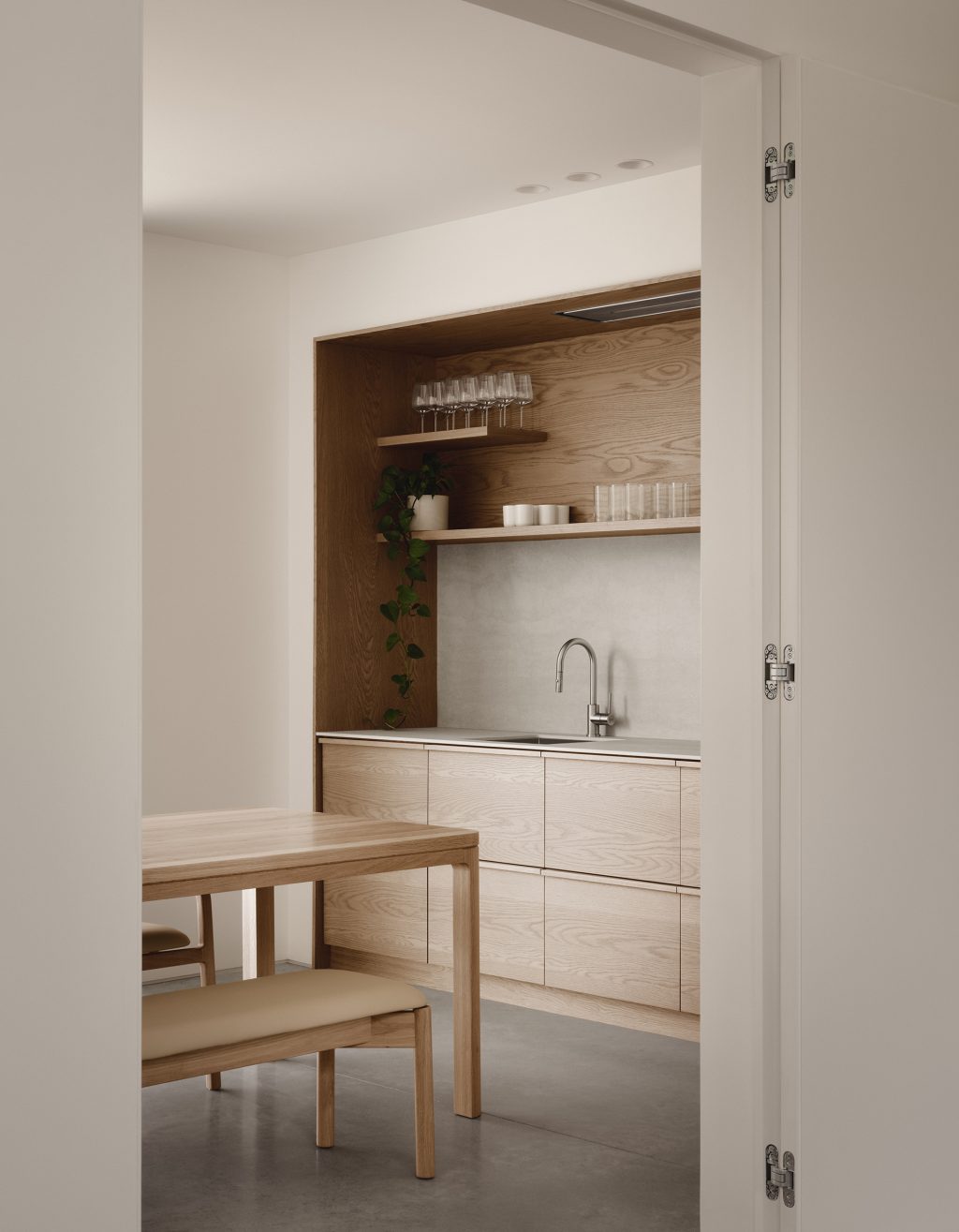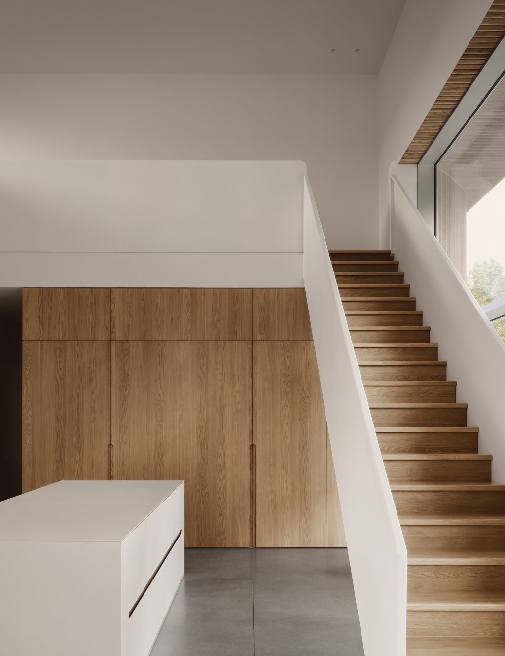 À l’intérieur, l’espace se dévoile dans un jeu d’équilibre délicat entre ouverture et intimité, entre fonctionnalité et ambiance. Un escalier sculptural en acier plié surmonté de chêne constitue le pivot central, reliant harmonieusement les espaces publics du rez-de-chaussée aux zones créatives de l’étage supérieur.