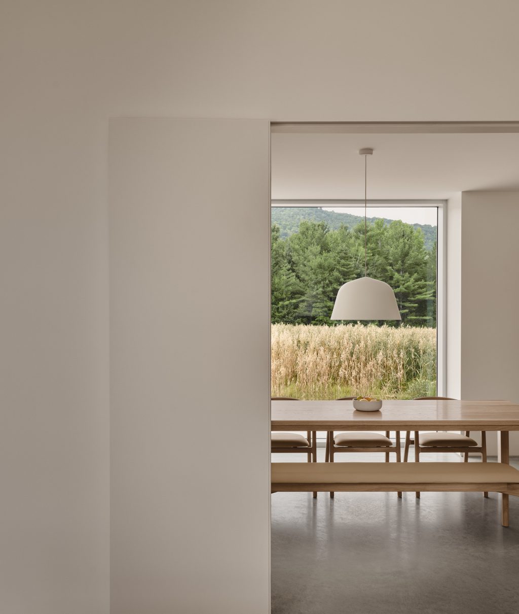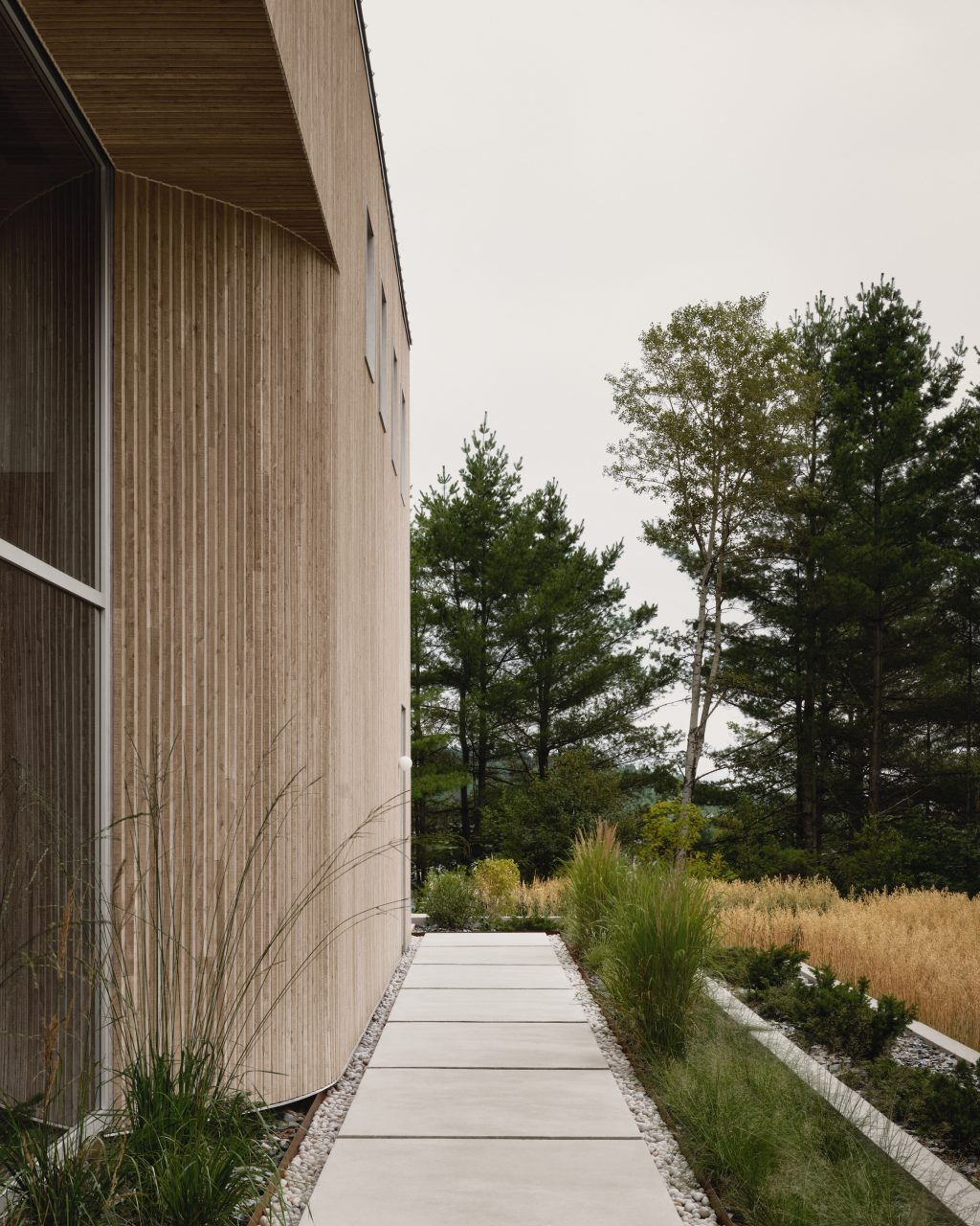 L’approche paysagère a également été centrale au projet. Ayant acquis le site pour ses perspectives, mais également pour ses qualités intrinsèques, il était primordial de préserver des portions intactes du site. Pour marquer une transition claire entre les espaces aménagés et la végétation naturelle existante, des bacs de plantation de béton remplis de graminées et de conifères ainsi que des dallages précis ont été réalisés. L’objectif était de créer un tampon visuel et sensoriel entre le bâtiment et la nature environnante. Ce seuil végétal affirme subtilement la présence humaine tout en protégeant l’intégrité de l’écosystème.