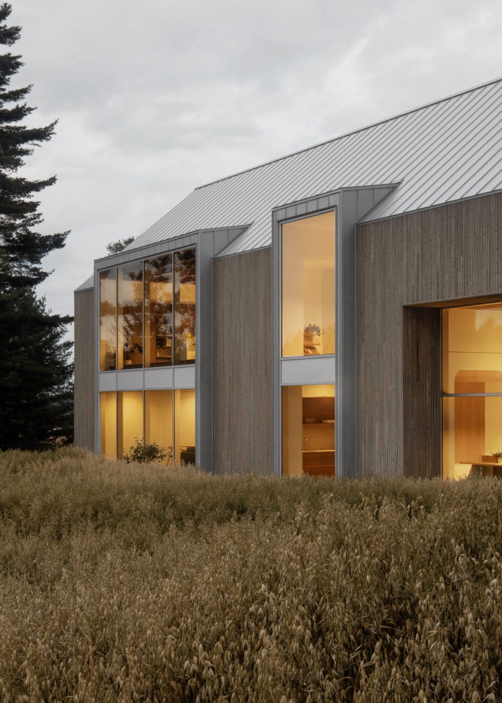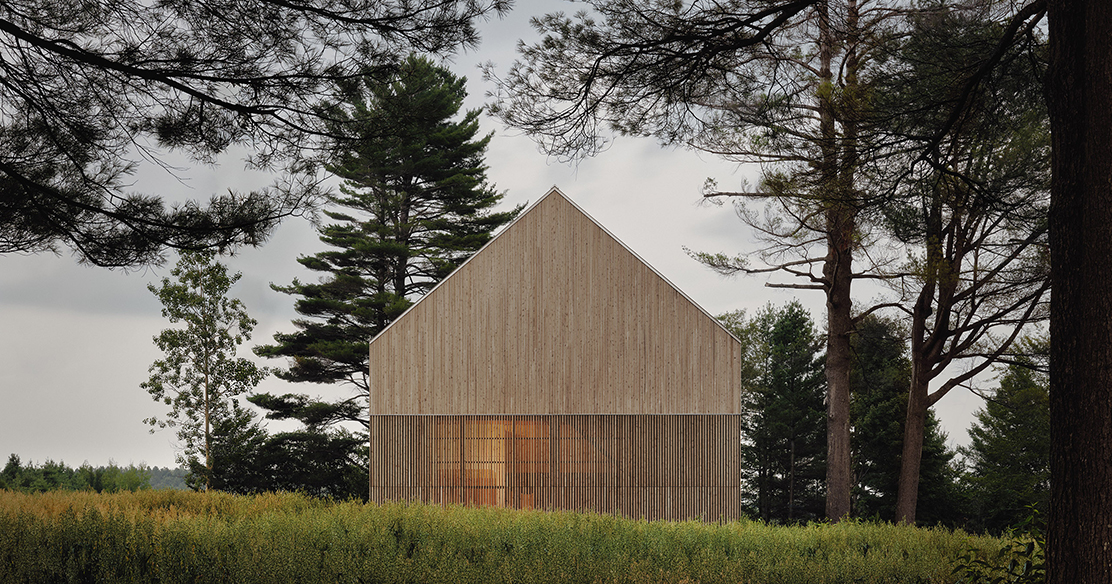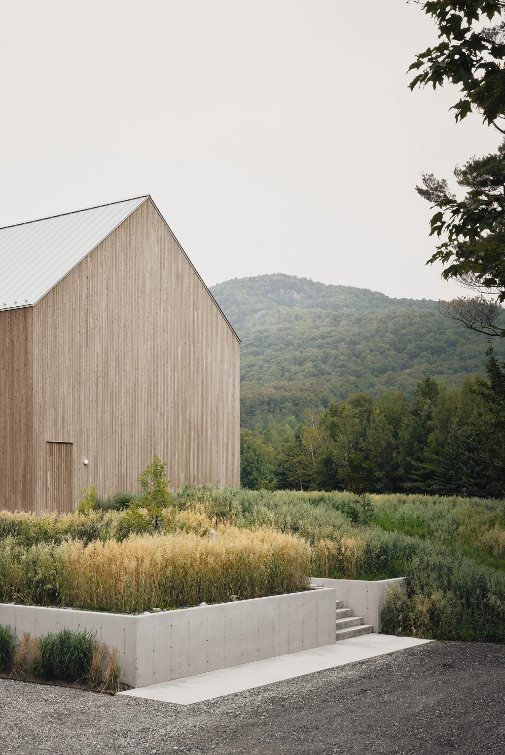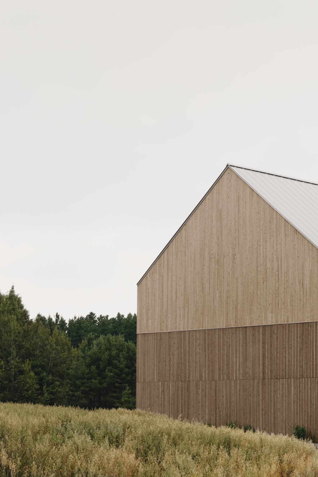 La géométrie rappelle le langage vernaculaire des granges de la région, sans pour autant effacer une contemporanéité fort appréciable. Le traitement des lattes de bois sur les façades, qui laisse filtrer la lumière, est un détail très bien exécuté.