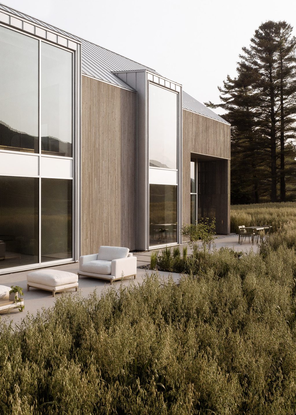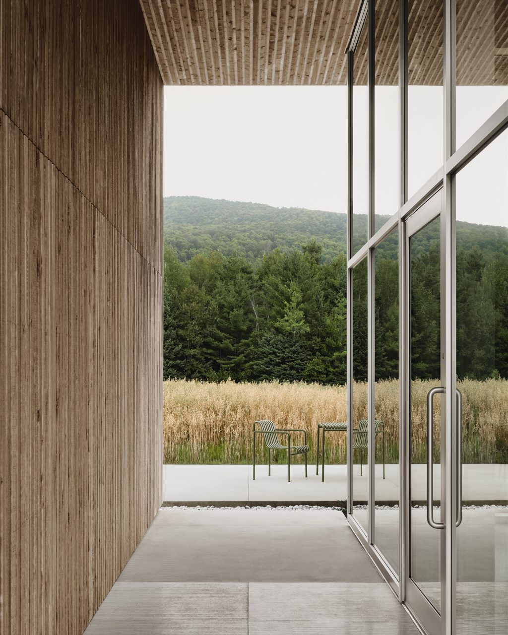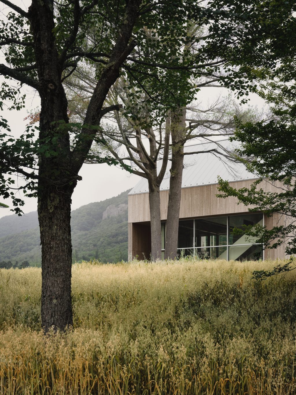 La géométrie rappelle le langage vernaculaire des granges de la région, sans pour autant effacer une contemporanéité fort appréciable. Le traitement des lattes de bois sur les façades, qui laisse filtrer la lumière, est un détail très bien exécuté.