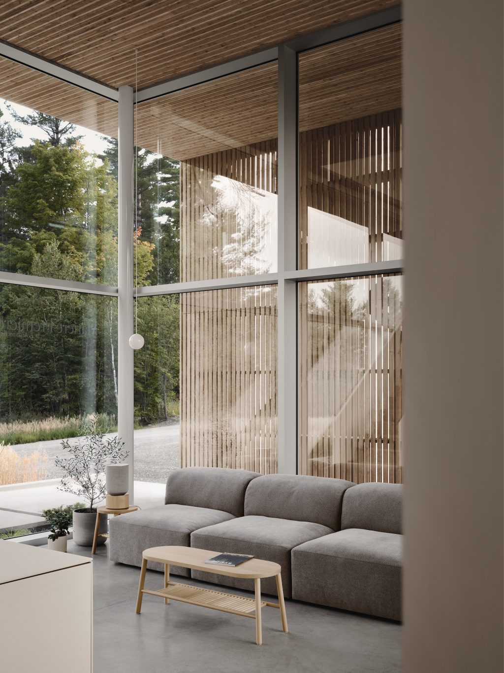 C’est ainsi que, dans cette région pittoresque du Québec, réputée pour ses paysages montagneux et ses forêts généreuses, émerge un projet architectural profondément sensible à son environnement : l’atelier Matière Première — Nu Drom. Niché dans un écrin de pins matures, ce projet ne se contente pas d’être une réalisation architecturale, il propose avant tout une expérience sensible et immersive.