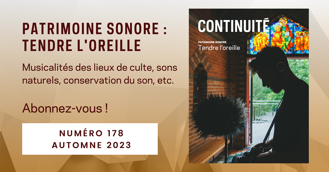 Ce dossier sera l’occasion d’inviter nos lecteurs à écouter les sons du quotidien qui forment la trame de nos vies et qui, au fil du temps, deviennent des éléments intangibles du patrimoine québécois. Les différents articles présenteront l’émergence du patrimoine sonore au Québec; permettront de découvrir les méthodes de conservation du patrimoine sonore; interrogeront des artistes québécois qui vouent leur pratique artistique à la mise en valeur du patrimoine sonore; feront entendre des sons qui caractérisent nos lieux de culte; décriront une plateforme d’écoute créée en France qui met en valeur des sons d’objets traditionnels, en plus de présenter le travail d’une archéologue du paysage sonore, notamment engagée pour travailler sur l’acoustique de la cathédrale Notre-Dame-de-Paris; feront découvrir le navire Ernest Lapointe du point de vue sonore, grâce à une exposition au Musée maritime du Québec; proposeront une incursion dans les sons du territoire, des vagues gaspésiennes aux vents de Mont-Tremblant, en passant par les forêts des quatre coins du monde (texte en exclusivité Web).