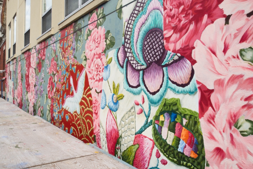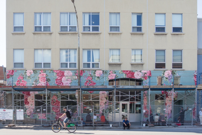 Baptisée « Éclosions », cette murale offre une véritable métamorphose à la façade de la plus grande ressource pour femmes sans-abri au Canada, située sur le boulevard de Maisonneuve Est.