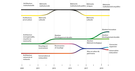 « Que penser des prix d’excellence attribués aux transformations patrimoniales, en particulier dans le contexte québécois ? À en croire la récurrence de ce genre de distinction dans le paysage contemporain des prix d’architecture, le patrimoine serait l’une des catégories canoniques de l’excellence architecturale. Malgré leur nombre, l’impressionnante variabilité de la nature des bâtiments récompensés par ces prix ne semble avoir d’égal que celle de leurs intitulés. Au Canada, les catégories jugées vont de la préservation à la conservation du patrimoine, en passant par la restauration, l’extension ou la rénovation comme on pourrait légitimement s’y attendre. Il est curieux, en revanche, de voir des notions qui semblent aussi éloignées du patrimoine que le recyclage, le développement durable, ou encore l’innovation récompenser l’intervention sur l’existant. Contrairement aux mentions que nous nommerons « programmatiques » qui récompensent des bâtiments aux fonctions spécifiques, ces prix « patrimoniaux » peuvent être accordés à tout type d’intervention architecturale, pour peu que celle-ci concerne un site construit, qu’il ait ou non une valeur historique.