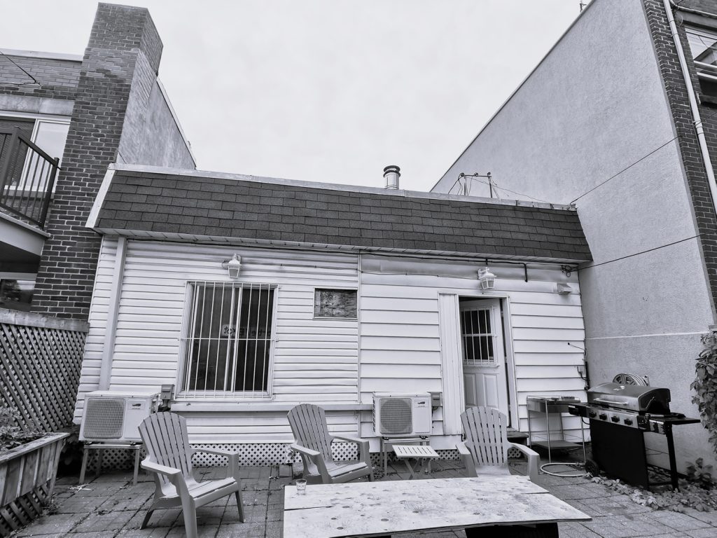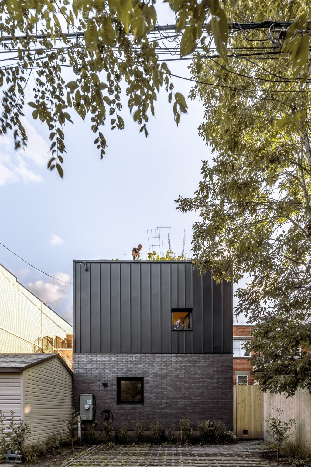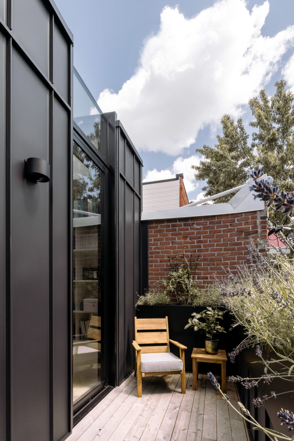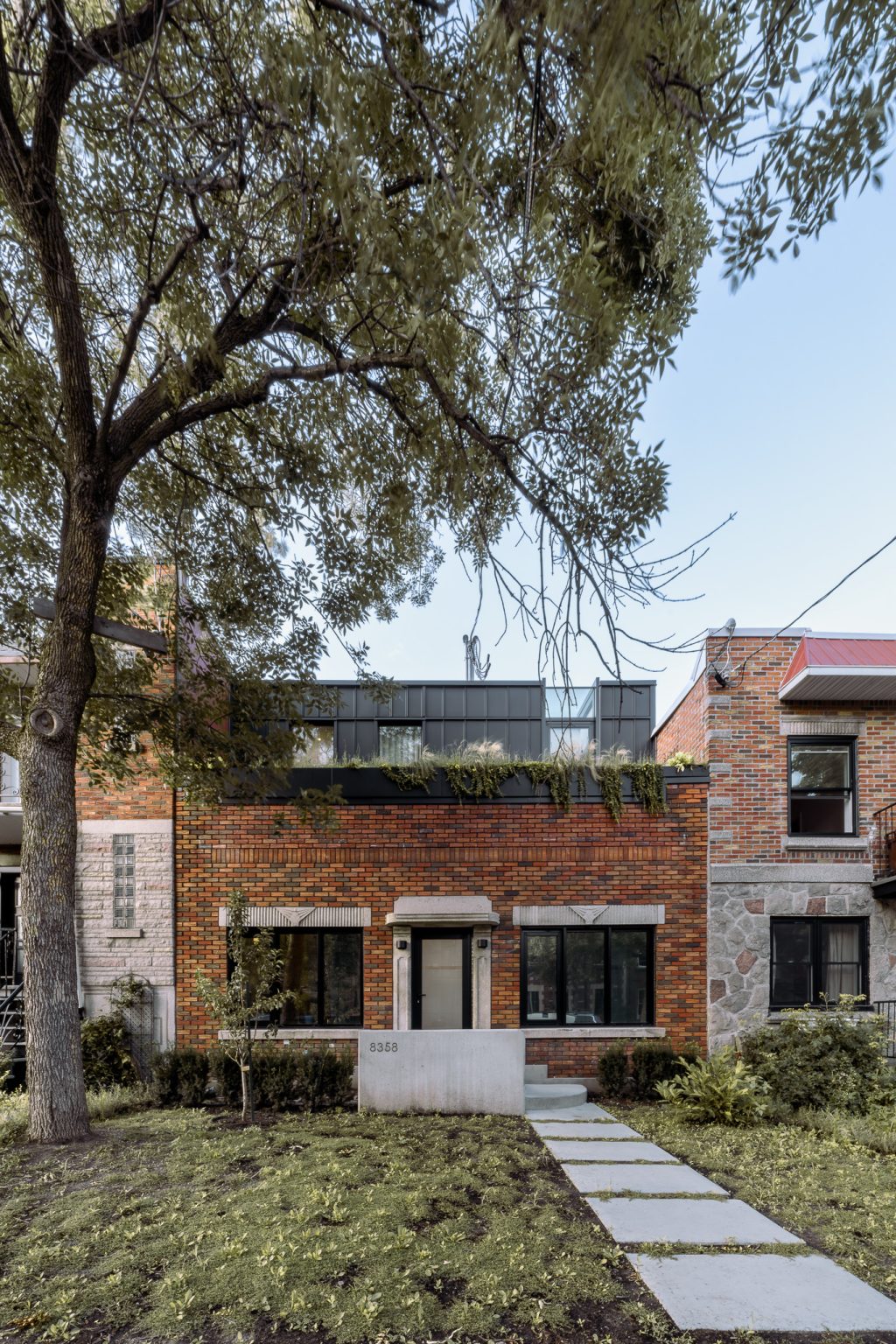 Dans une volonté de conservation patrimoniale, l’arrondissement a répertorié et classé l’ensemble des « shoebox » en différentes catégories d’intérêt. Dans ce cas-ci, il était obligatoire de préserver la façade existante, mais il fut permis d’y ajouter un étage. Dans un souci de respect du volume initial du « shoebox » et de conservation de ses valeurs patrimoniales, il a été intuitif de proposer un recul de l’addition à l’étage. Ce retrait bien marqué permet d’offrir une terrasse végétale intime côté rue, orientée Sud.