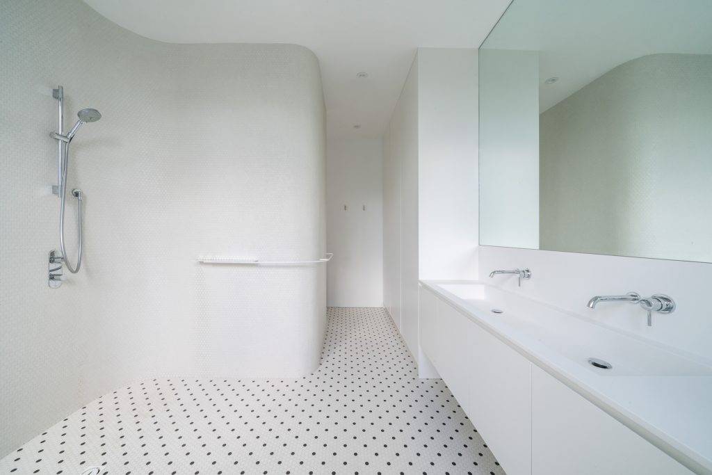 La façon dont la luminosité pénètre au cœur des espaces de vie est un clin d’œil aux multiples puits de lumière arrondis du musée Miro de l’architecte Josep Lluís Sert à Barcelone. Une faille traversante au niveau du toit, coiffée d’un lanterneau continu, laisse pénétrer une lumière forte venant du Sud qui se diffuse doucement sur une surface courbe, plâtrée en blanc. Ainsi, telle une « boîte à lumière » utilisée en photographie, le projet tout de blanc est contenu dans une enveloppe noire.