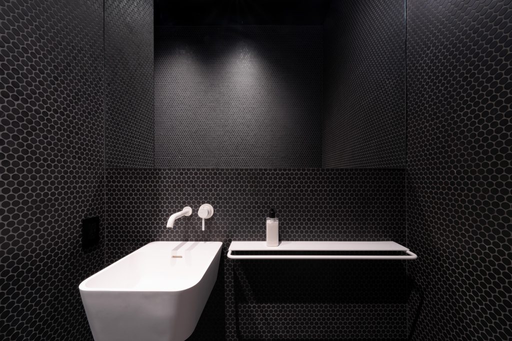 Le mobilier intégré en chêne blanc, les planchers de chêne en chevrons, les armoires de cuisine laquées en blanc et la céramique ronde pour la salle de bain principale sont tous des matériaux discrets qui concèdent à la maison une atmosphère paisible et chaleureuse. Afin d’assurer une harmonie, un contraste de matériaux noirs et blancs est utilisé, notamment dans les céramiques, rappelant ainsi la dualité que propose la « boîte à lumière ».