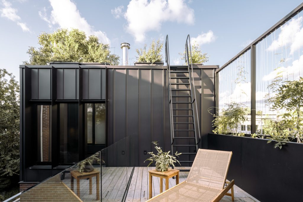 L’ensemble des façades extérieures est habillé d’un revêtement en acier peint noir afin de mettre en évidence les briques nuancées et chaudes du « shoebox » existant. Au niveau de la cour intérieure, des lames en acier peint en noir sont appliquées sur la surface des meneaux des fenêtres afin de créer un jeu de profondeur et d’ombrages selon le parcours du soleil, tout en assurant une certaine intimité vis-à-vis des voisins adjacents.