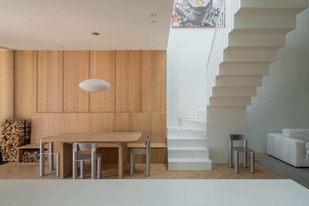 Chapeau également à l’escalier métallique immaculé, sculptural à souhait, qui devient une pièce d’art en soi pour accompagner les œuvres murales des propriétaires passionnés d’architecture. Le bois omniprésent (mobilier, plancher, etc.) vient équilibrer le décor intérieur, qui aurait pu être froid et austère sans cet ajout.