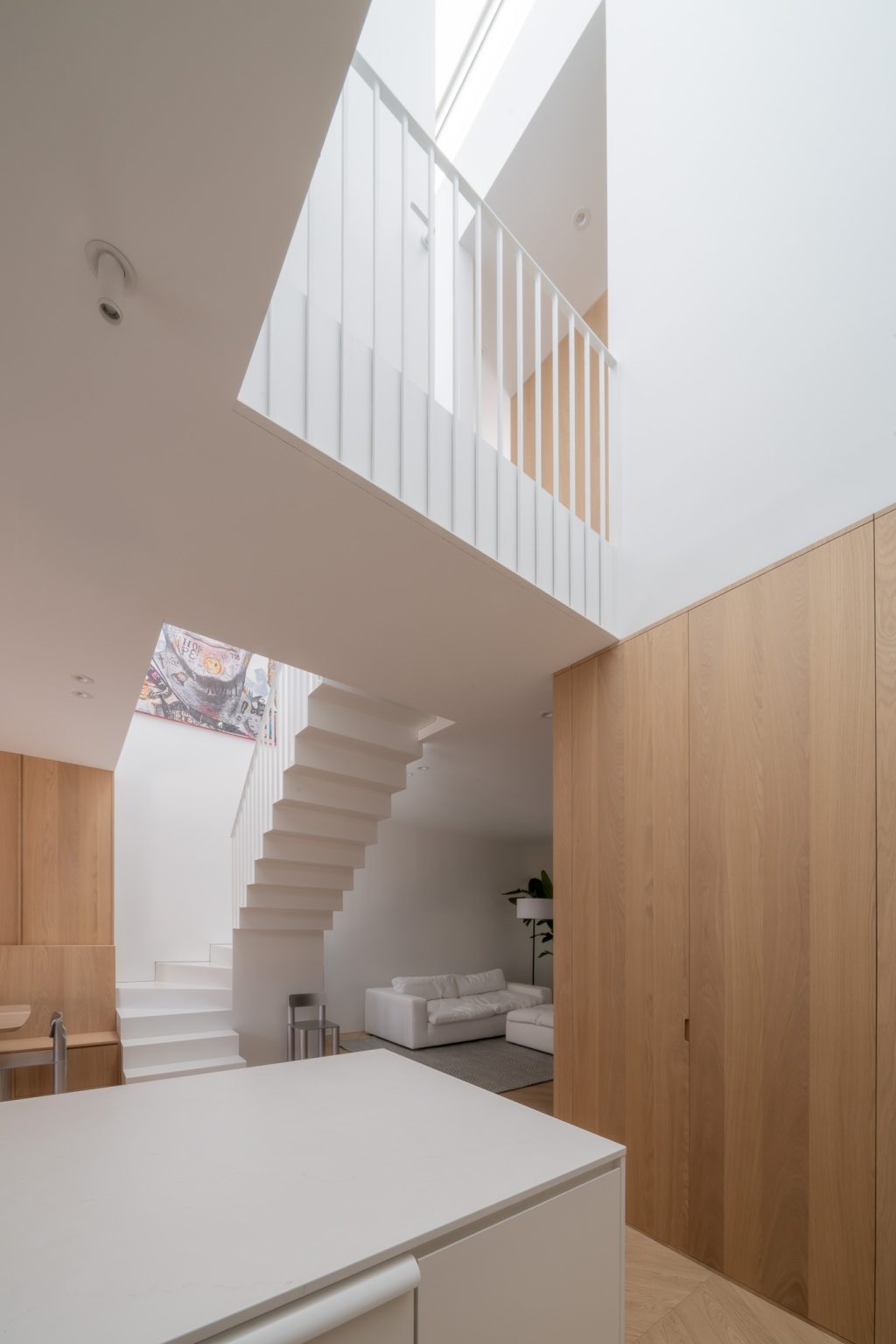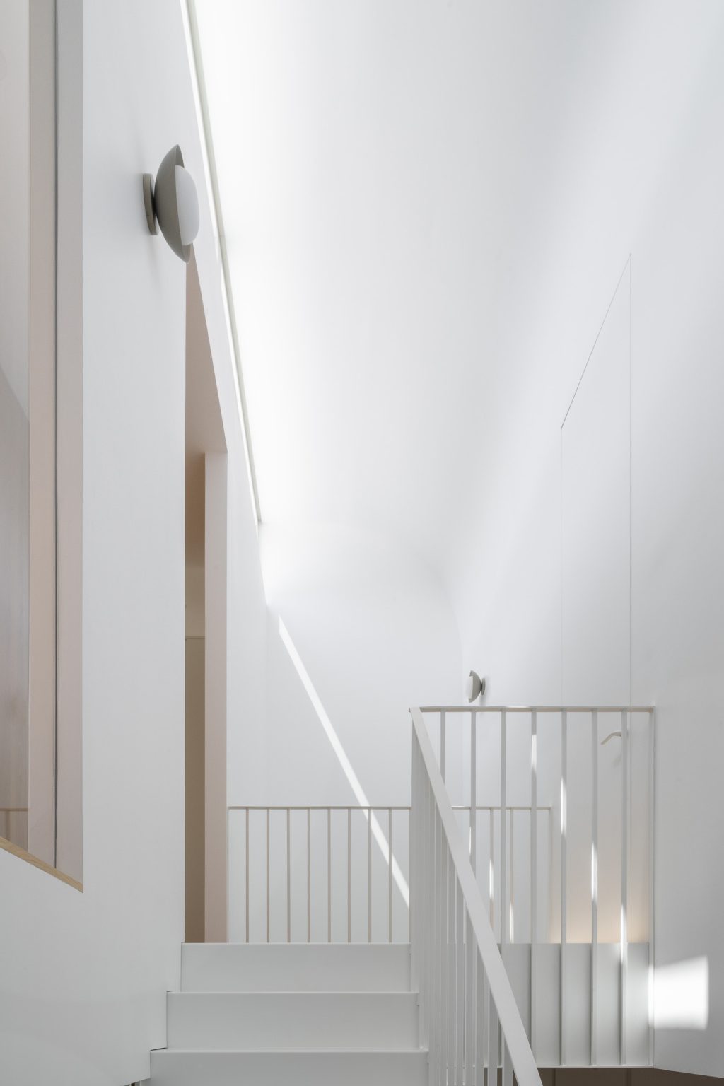 La circulation entre les étages se fait par un escalier central inséré dans une brèche transversale au niveau du plancher et de la toiture de la maison. Les marches et les limons sont formés d’un pliage d’acier continu sur lesquels sont soudés de fins barreaux peints en blanc. Surmonté d’un puits de lumière linéaire, l’escalier devient l’élément phare de la maison ; sculptural et léger, il permet une lecture toute en transparence des espaces de vie avec une meilleure diffusion de la lumière, du lanterneau jusqu’au rez-de-chaussée de la maison.