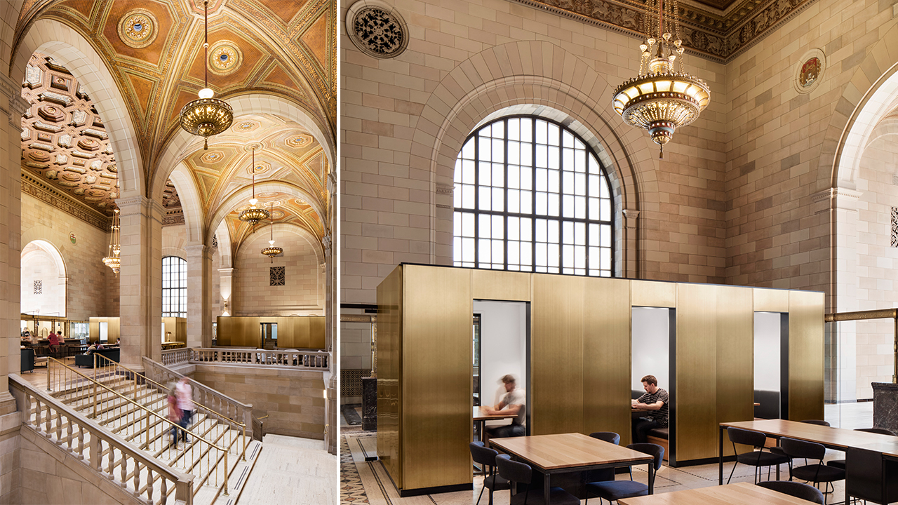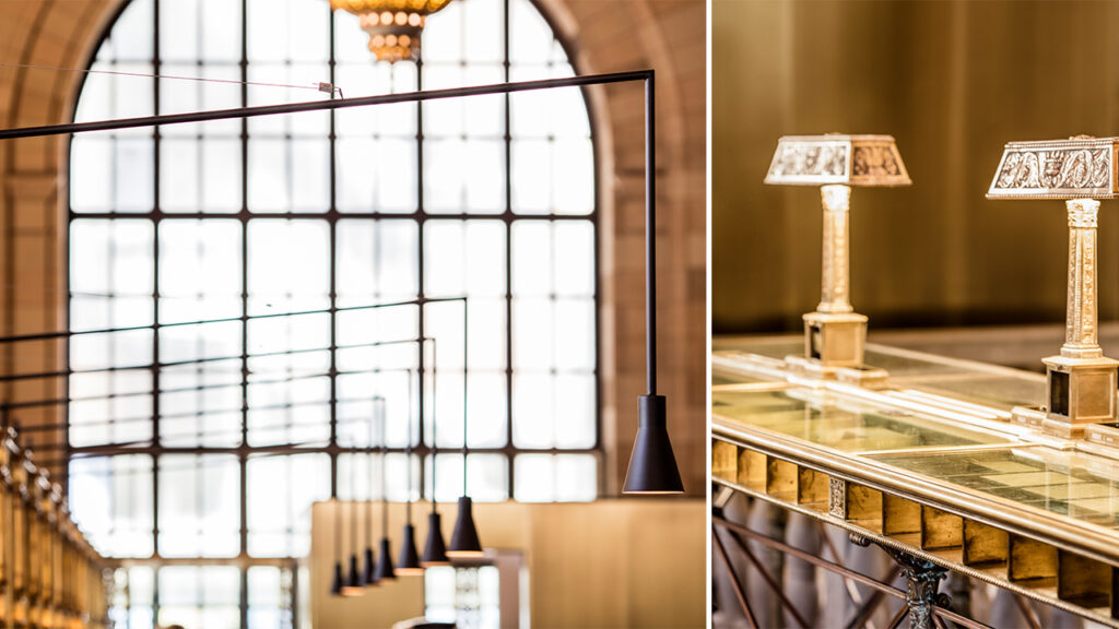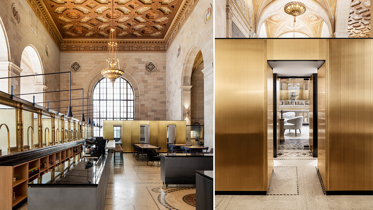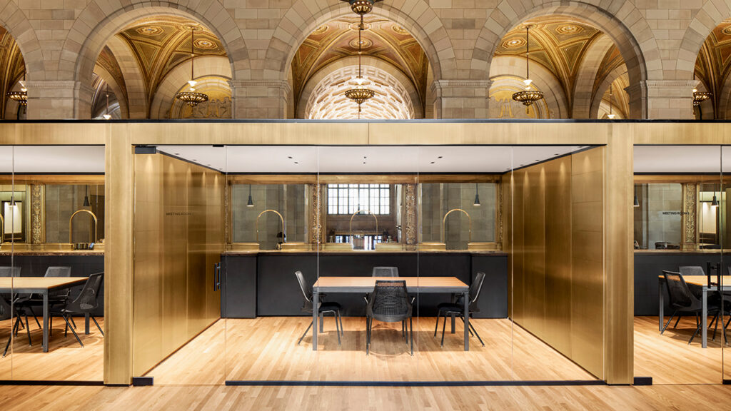 Ce sont d’ailleurs ces éléments existants patrimoniaux qui ont présenté une véritable opportunité architecturale. Cette remarquable coquille contenant des vestiges de toutes sortes, démontrant le talent des artisans de l’époque est maintenant recyclée. Le bâtiment de 1926, muni d’un plancher de marbre, d’un plafond décoratif en plâtre peint, de plusieurs éléments en laiton coulé, présente un fond indéniable. Faisant face à cette riche présence de détails, le nouveau projet doit établir une relation entre l’ancien et le contemporain. Il s’agit d’intervenir avec discrétion, de ressusciter ce lieu avec un nouvel usage, une nouvelle vie, qui prend forme par des gestes simples et dépouillés. Les nouveaux murs sont recouverts d’acier plaqué avec du laiton, de façon à établir une relation avec les éléments en laiton d’origine. Les cloisons qui divisent les salles de conférence, font par hasard un clin d’œil aux anciens présentoirs de la banque où se situaient, à l’époque du papier, des casiers pour les feuilles de dépôts. Maintenant, ces meubles ressemblent à une maquette pour la nouvelle intervention.