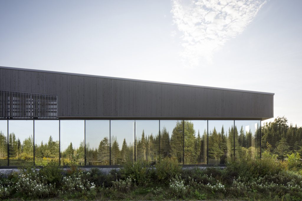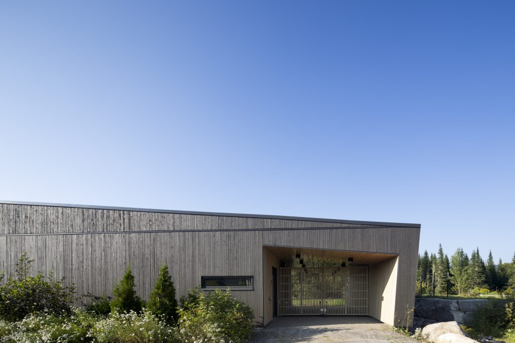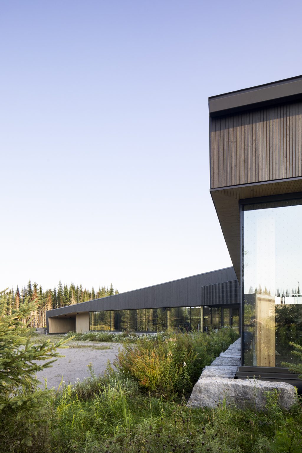 La volumétrie sobre, les toitures à faible pente et la structure en bois rappellent l’esprit des camps forestiers d’antan. Le revêtement en épinette foncée, posé verticalement, évoque les stries des billes de bois. Caractérisé par un jeu subtil de pleins et de vides, le parement module les ombrages sur les façades selon la course du soleil.