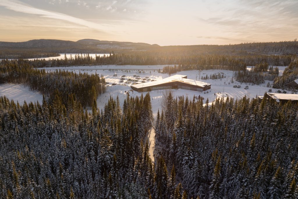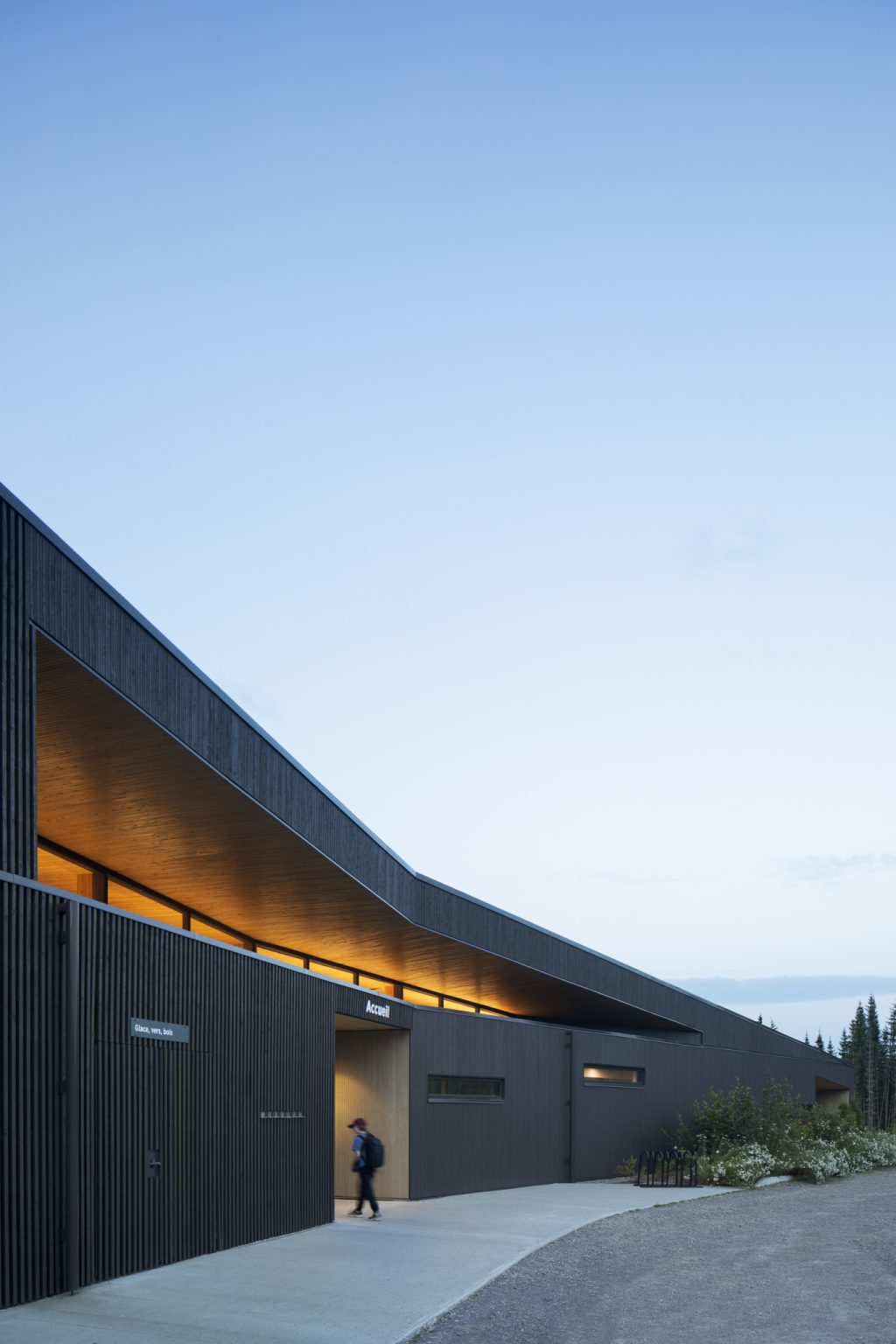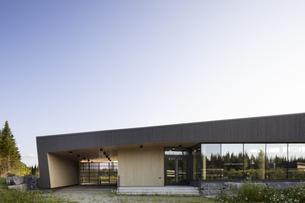 Ce projet a attiré notre attention par son utilisation judicieuse du bois, particulièrement pertinente dans ce contexte en nature. Situé à l’entrée de la Réserve faunique des Laurentides, le bâtiment s’intègre avec soin au paysage tout en affirmant sa présence par une volumétrie audacieuse.