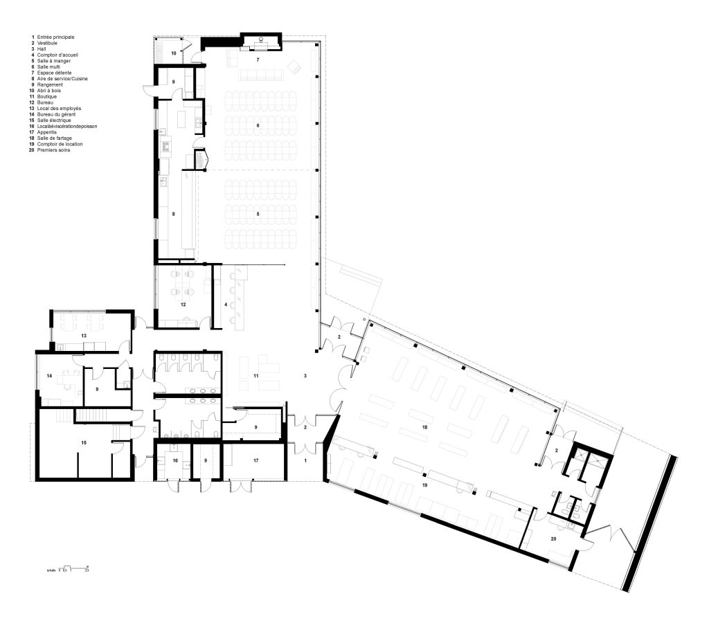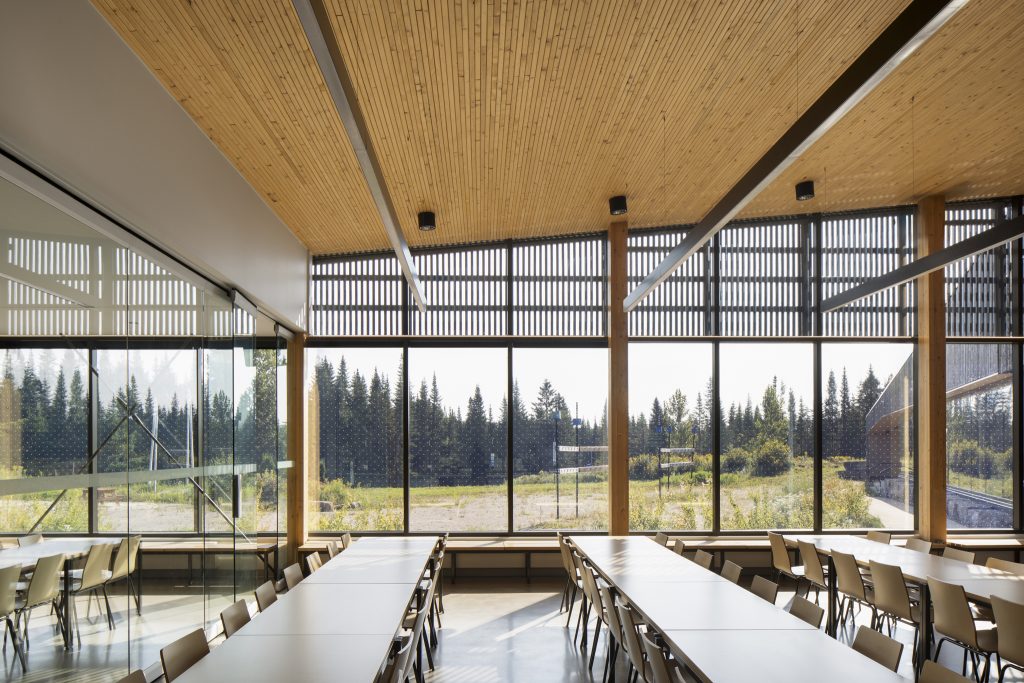 La généreuse fenestration offre des espaces intérieurs forts agréables qui trouvent l’équilibre entre la chaleur d’un camp et la rigueur institutionnel du lieu. Le plan atypique constitue quant à lui une réponse habile aux contraintes du site, notamment en atténuant les nuisances sonores de la route adjacente.