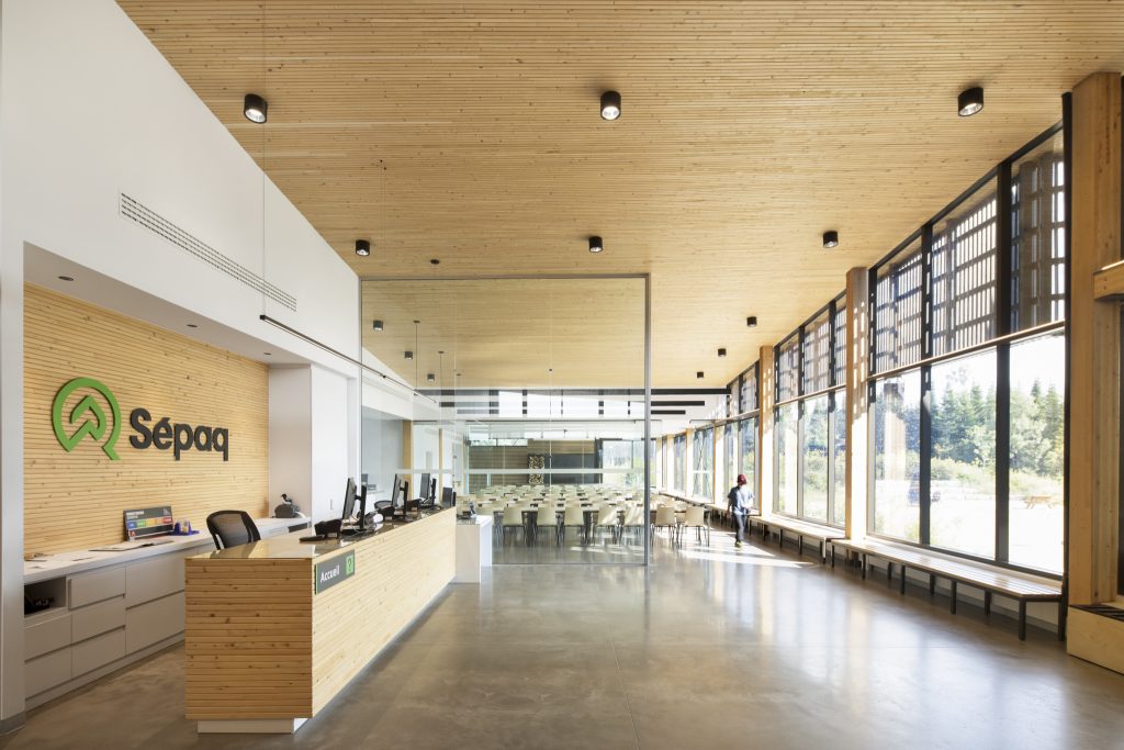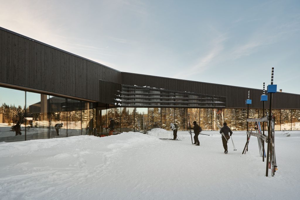 L’implantation du bâtiment, sur un seul niveau, favorise l’accessibilité universelle tout en minimisant les nuisances sonores de la route adjacente. L’intégration du pavillon au paysage des montagnes laurentiennes ainsi que l’organisation efficiente des espaces de vie et des services, répartis en trois ailes autour d’un cœur central, favorisent l’optimisation et la fluidité des circulations et des opérations tout en offrant aux visiteurs une expérience renouvelée tout au long de l’année.
