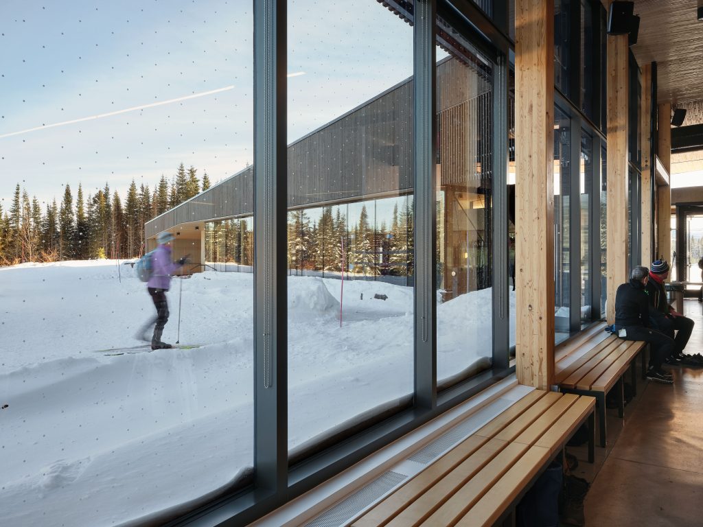 Matériau noble et polyvalent, le bois est exploité pour la structure, le revêtement extérieur ainsi que dans les composantes intérieures et le mobilier intégré. Les systèmes constructifs s’adaptent aux besoins des espaces : un système de poutres et poteaux permet de grandes portées dans les secteurs largement fenestrés et les zones composées de murs ajourés assurent la ventilation naturelle des abris à bois et espaces semi-extérieurs ouverts. Dans les secteurs plus fermés, le système est composé d’une ossature légère en bois, recouverte à l’extérieur d’un revêtement en bois local. La teinture opaque de couleur foncée a été choisie pour des raisons de durabilité sur les surfaces exposées alors qu’une teinture pâle est utilisée dans les portions abritées pour marquer les entrées et orienter le parcours des visiteurs. Un plafond en lambris de bois enveloppe les aires de contemplation d’une chaleur feutrée, accompagnant le visiteur dans un parcours fluide à travers le paysage et les activités du site.
