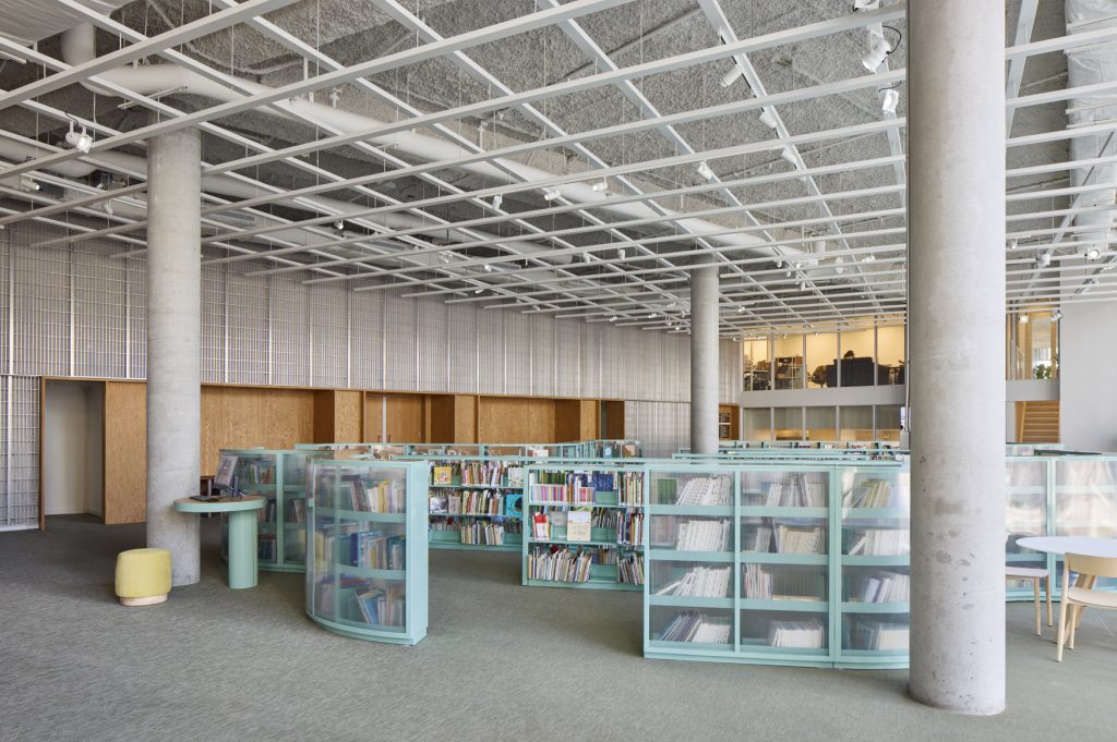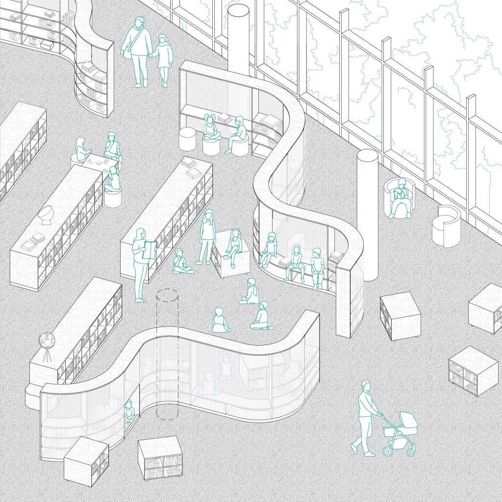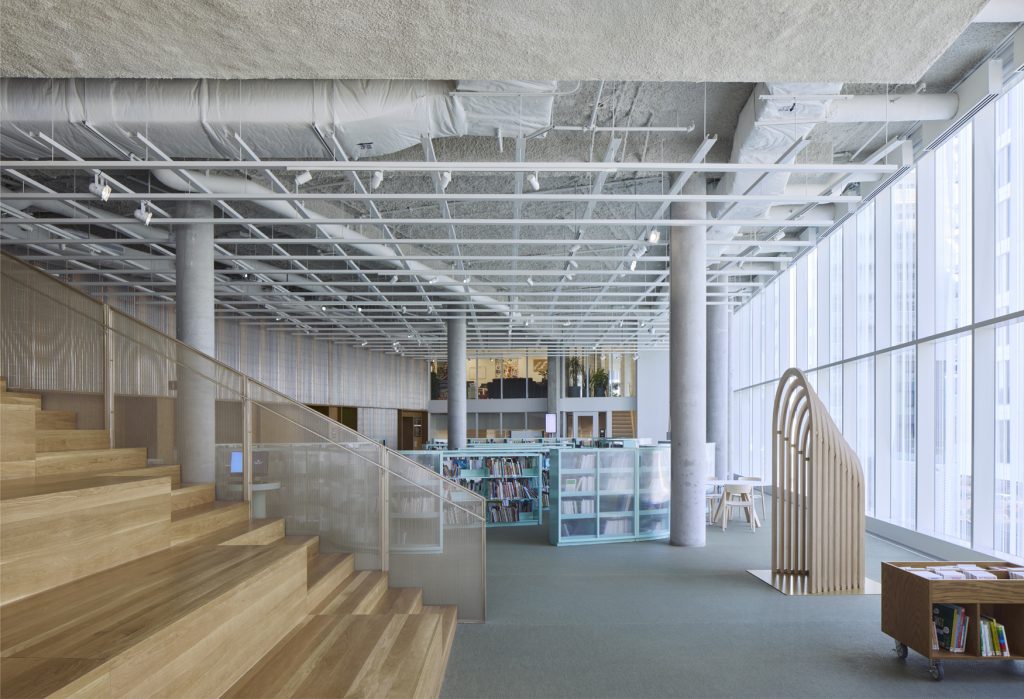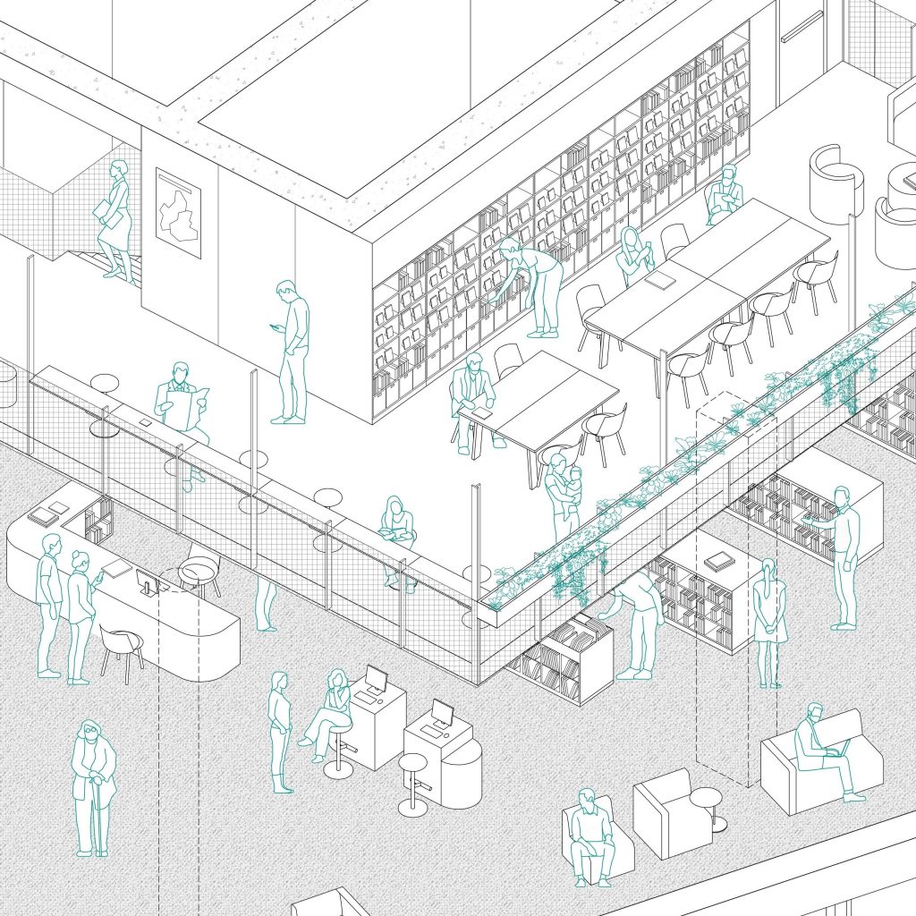 L’organisation du Centre Sanaaq repose sur une agora centrale, espace fluide et structurant qui articule les principales fonctions publiques du rez-de-chaussée. Ce niveau accueille un café, une salle multifonctionnelle, une salle de spectacle et des bibliothèques express, tous disposés en périphérie de l’agora de manière à encourager la déambulation et les croisements informels. Un large escalier baigné de lumière relie cette séquence dynamique au niveau supérieur, où se déploie la bibliothèque autour d’une mezzanine centrale. Celle-ci organise les zones jeunesse, adulte, lecture et travail en sous-espaces différenciés, mais interconnectés. En façade, les aires jeunesse dialoguent avec le médialab suspendu, prolongeant l’idée d’un lieu public en constante activation.