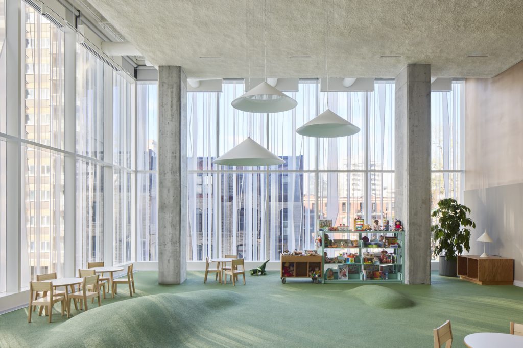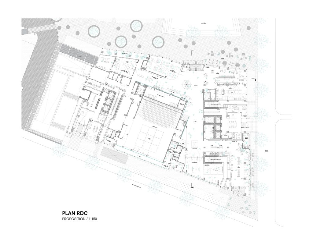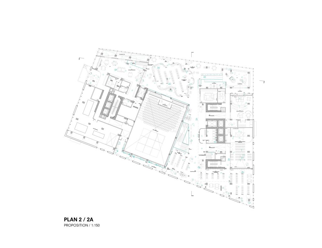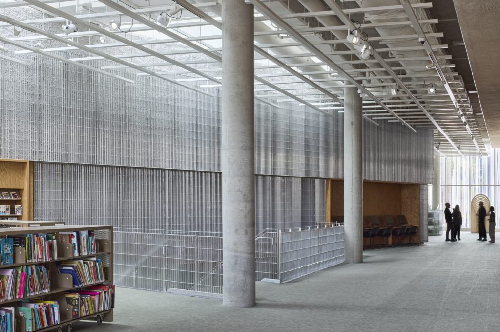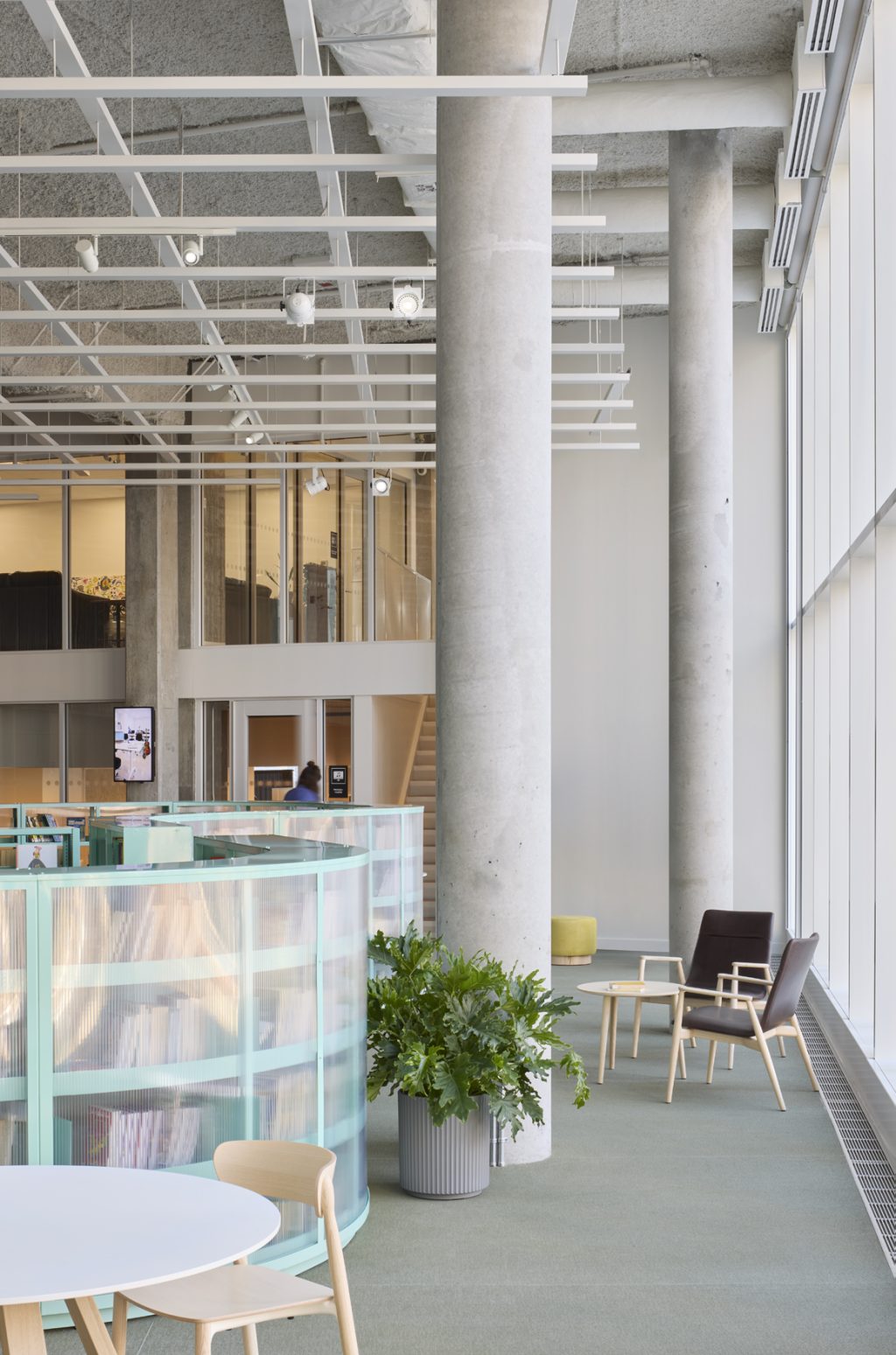 L’organisation du Centre Sanaaq repose sur une agora centrale, espace fluide et structurant qui articule les principales fonctions publiques du rez-de-chaussée. Ce niveau accueille un café, une salle multifonctionnelle, une salle de spectacle et des bibliothèques express, tous disposés en périphérie de l’agora de manière à encourager la déambulation et les croisements informels. Un large escalier baigné de lumière relie cette séquence dynamique au niveau supérieur, où se déploie la bibliothèque autour d’une mezzanine centrale. Celle-ci organise les zones jeunesse, adulte, lecture et travail en sous-espaces différenciés, mais interconnectés. En façade, les aires jeunesse dialoguent avec le médialab suspendu, prolongeant l’idée d’un lieu public en constante activation.