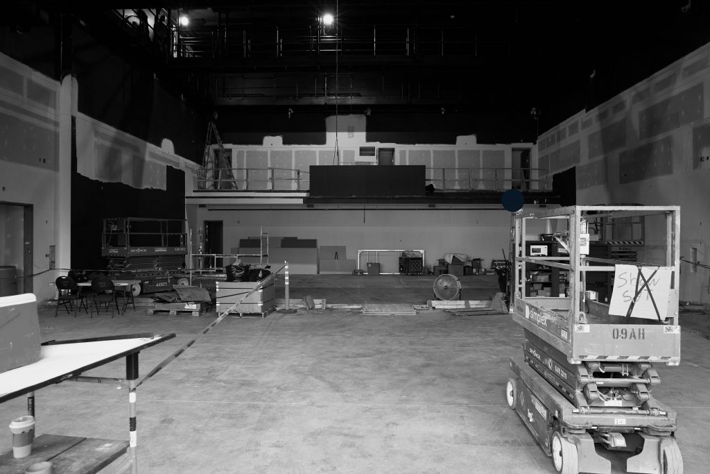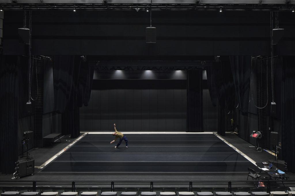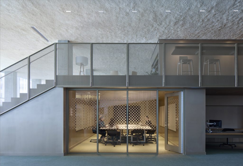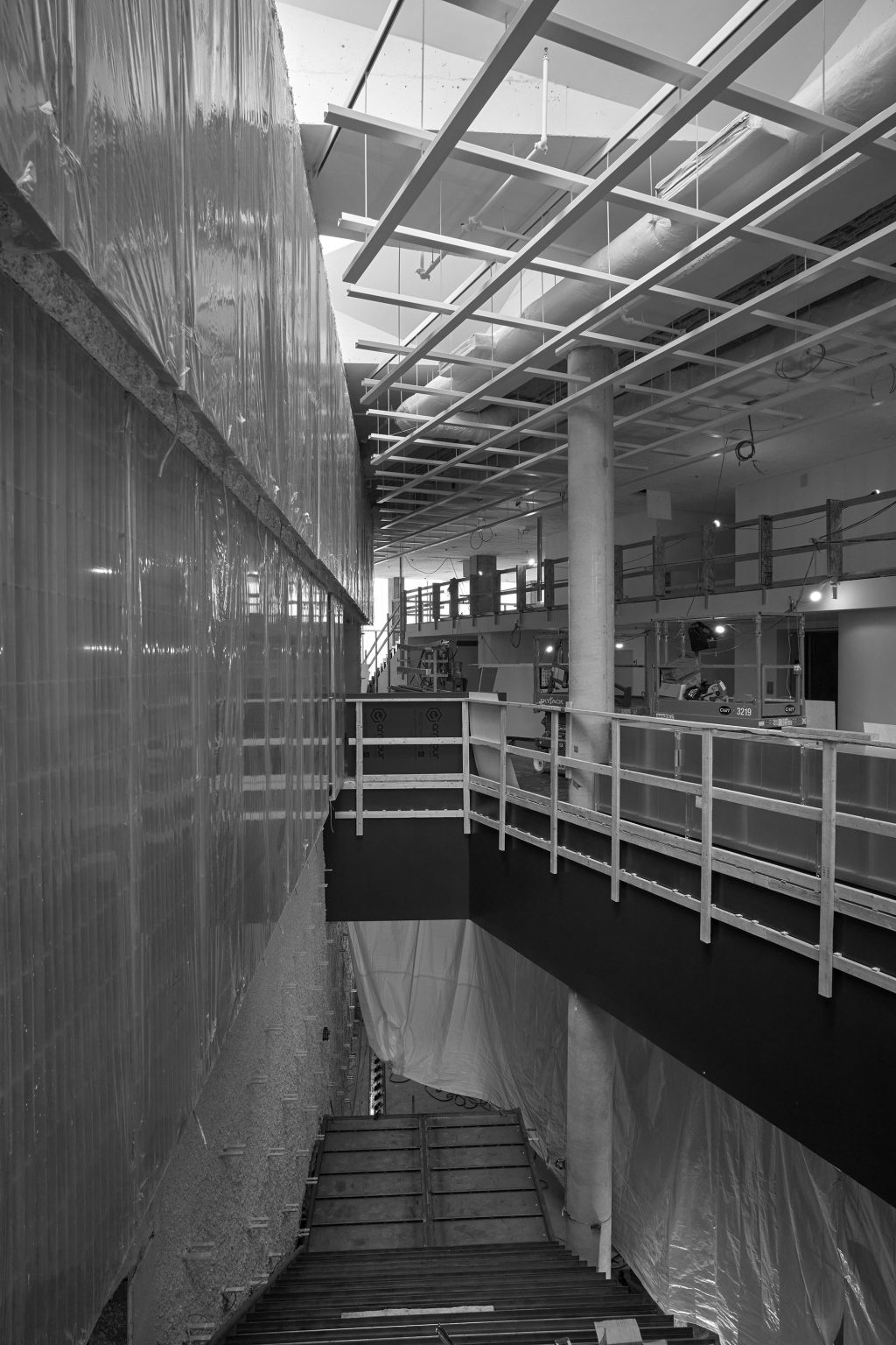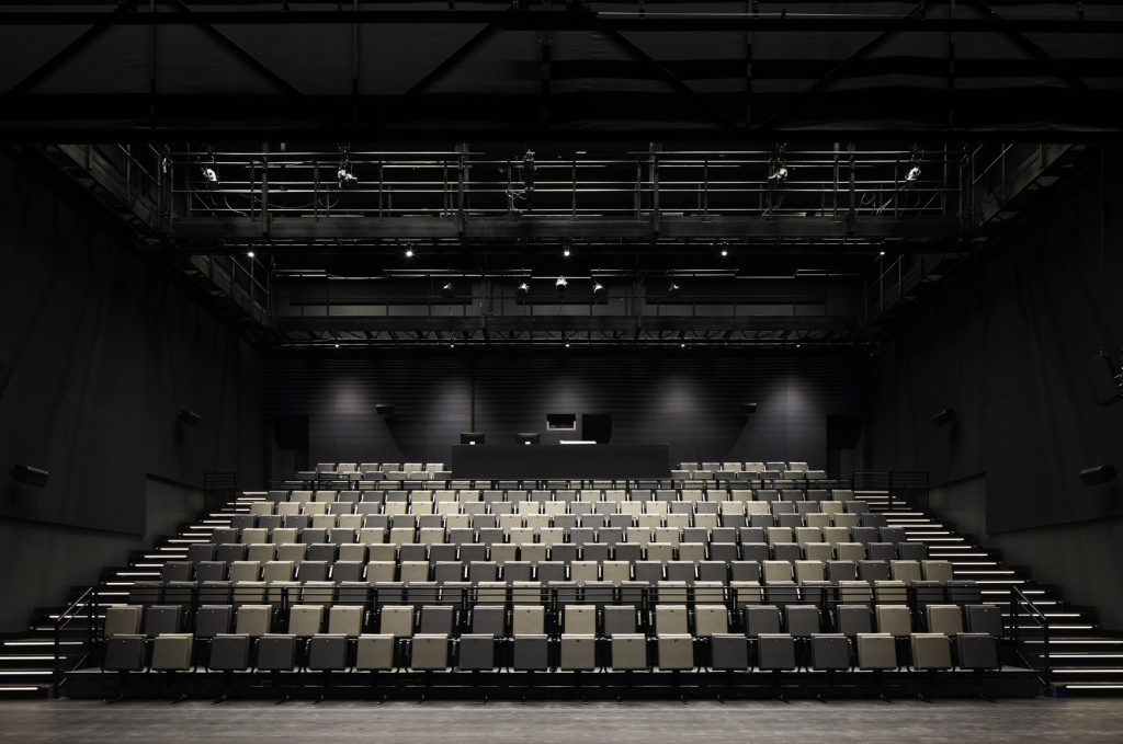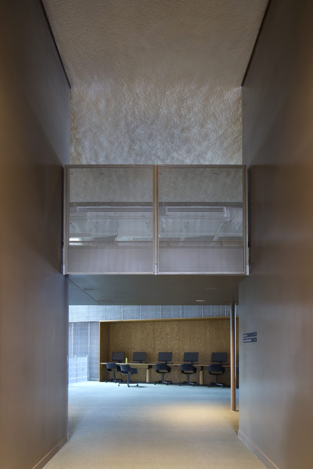 La nécessité de résoudre le décalage entre des cibles acoustiques très élevées et les grands espaces ouverts s’est avéré être un moteur important de la stratégie matérielle. L’utilisation extensive de cellulose giclée, directement exposée sur les plafonds, ou protégée par les caillebotis sur les murs de la salle de spectacle, a permis de limiter la réverbération et augmenter l’absorption à des niveaux exceptionnellement bas pour ce type d’espace.