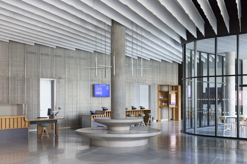 Fruit d’une collaboration étroite entre Pelletier de Fontenay, Atelier Zébulon Perron et Architecture 49, le Centre Sanaaq explore les frontières poreuses entre architecture, design d’intérieur, mobilier et scénographie. Situé au basilaire d’une nouvelle tour du centre-ville de Montréal, le projet utilise une architecture existante à la fois généreuse et complexe comme site d’intervention. En la traitant comme un paysage urbain qu’on traverse, le projet renforce la vocation publique du lieu.