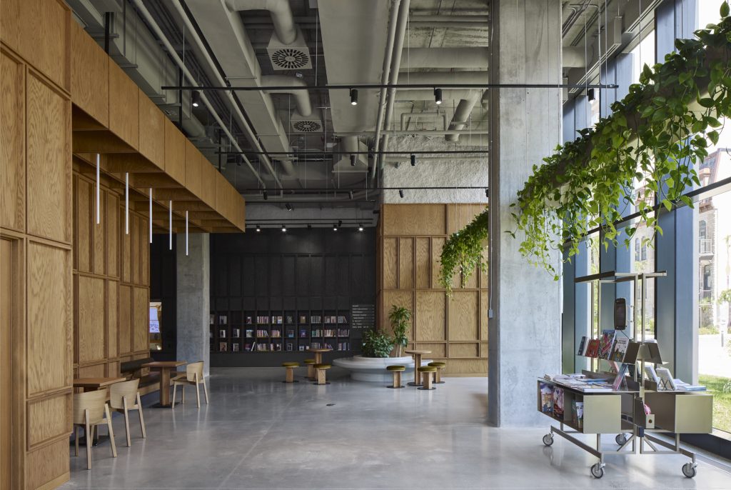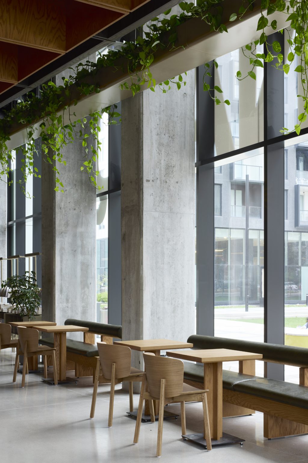 La présence de végétation, intégrée à même l’architecture intérieure, contribue pour sa part à adoucir les ambiances et à créer un sentiment de bien-être. Placés stratégiquement, notamment dans le laboratoire culinaire et près de la zone libre-service, des bacs de plantation permettent aussi aux usagers de s’initier à l’agriculture urbaine au cœur même du centre.