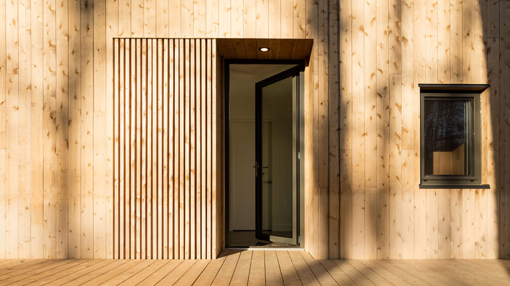 Les ouvertures dans le volume ont été dictées par l’architecture intérieure. De l’extérieur, leur alignement partiel et les différentes tailles des fenêtres créent une trame organique, rappelant les nœuds et les trous des troncs avoisinants.