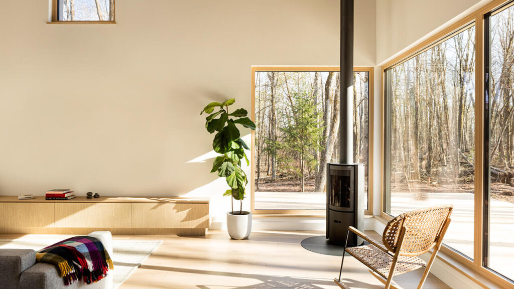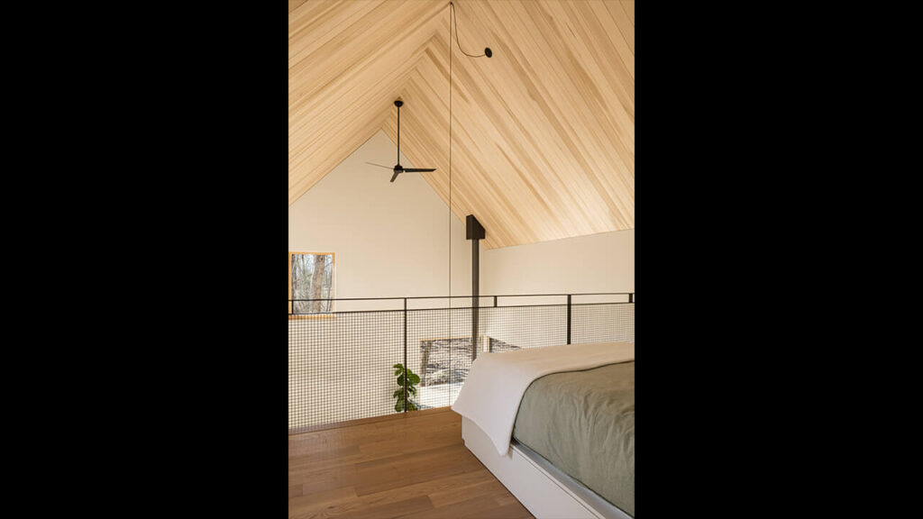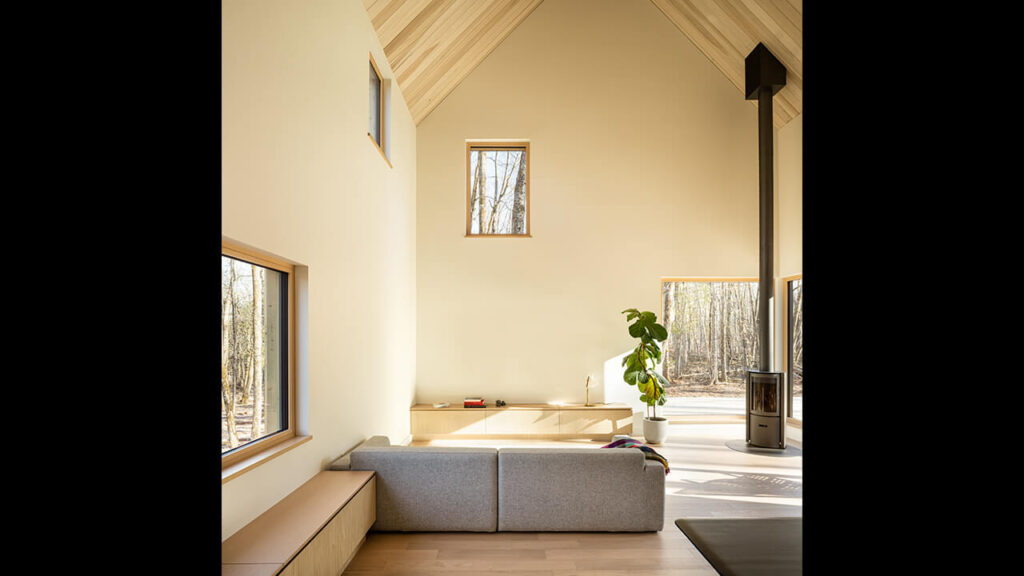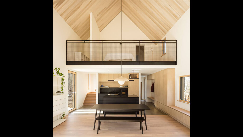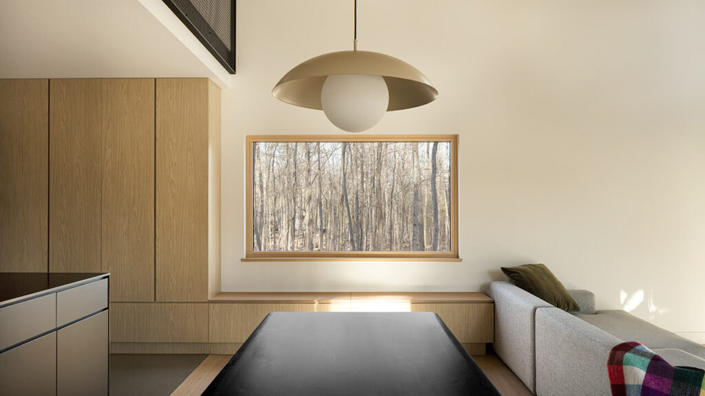 Les lattes en peuplier du plafond cathédral sont visibles dans toutes les pièces du deuxième niveau, créant un lien entre les espaces tout en les agrandissant. Un soin particulier a été apporté aux ouvertures dans chacune des pièces, assurant une connexion pertinente avec la forêt. Dans l’aire de vie commune, les ouvertures en hauteur cadrent certains arbres et invitent à la contemplation de l’écorce lisse d’un peuplier ou des feuilles généreuses d’un érable.
