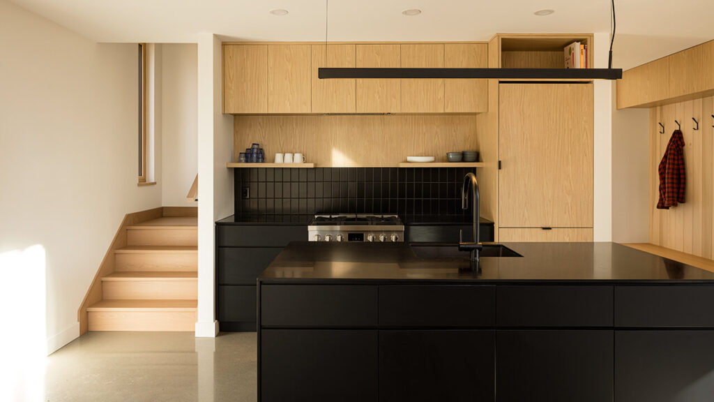 De l’entrée discrète, légèrement en retrait, on accède au vestiaire, à une salle de bain, au sauna et à la chambre des enfants. Le programme regroupe les pièces dont les fonctions invitent à de fréquentes allées et venues à l’extérieur. La matérialité à toute épreuve du plancher en béton s’étend jusque dans la cuisine, elle tranche avec le plancher en bois plus délicat qui habille le reste de la maison. Le contraste entre la petitesse de l’entrée et l’espace commun sur deux niveaux rend l’aire de vie principale majestueuse avec sa mezzanine perchée, donnant l’impression d’être dans les arbres.