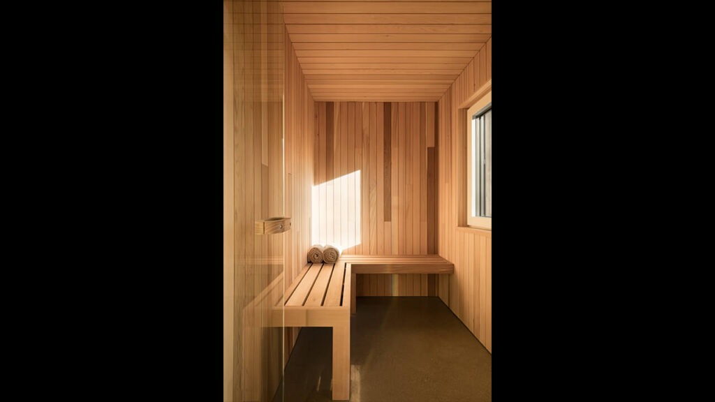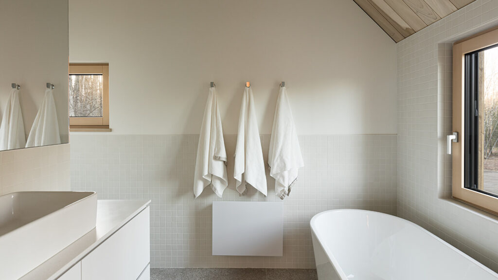 La palette de matériaux et de teintes est minimaliste pour créer des intérieurs clairs et apaisants. Ici, l’architecture agit comme un bain de forêt.