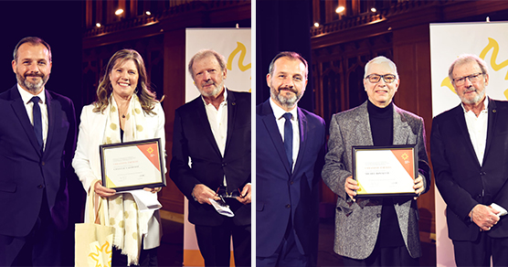GAUCHE : De gauche à droite : Sylvain Gariépy, président de l’OUQ, Chantal Laliberté, urbaniste émérite, et Jean Paré, président du Comité reconnaissance de l’OUQ | DROITE De gauche à droite : Sylvain Gariépy, président de l’OUQ, Michel Bonnette, urbaniste émérite, et Jean Paré, président du Comité reconnaissance de l’OUQ