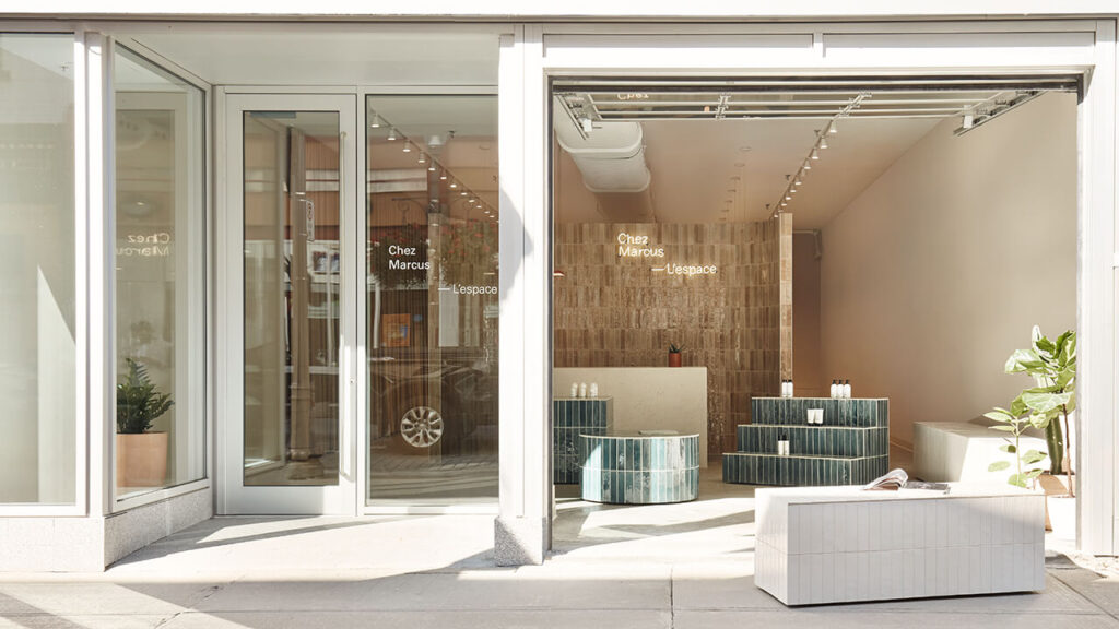 Situé sur la rue Saint-Joseph dans le quartier Saint-Roch de la ville de Québec, Chez Marcus – L’espace prend place dans une succession d’espaces publics. Empruntant les fragments d’un univers urbain, la vitrine du salon s’ouvre sur la rue pour inviter et offrir un lieu de rencontre informel, à la frontière entre l’intérieur et l’extérieur.