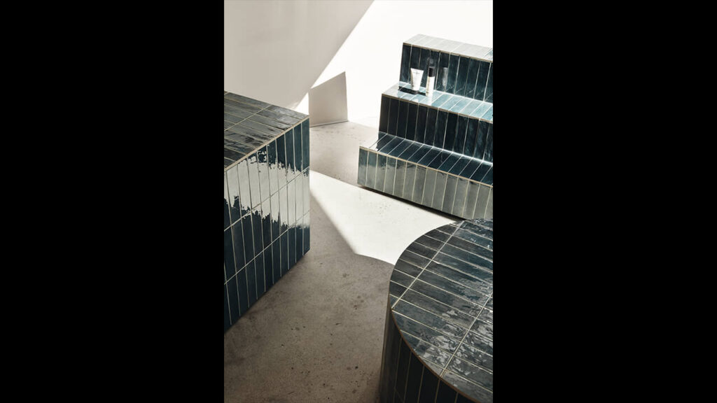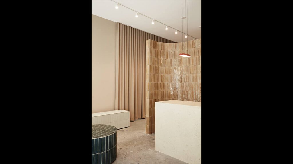 Accueilli par divers extraits de briques servant tantôt d’assises, tantôt de présentoirs, le visiteur est amené à s’engager dans une déambulation spatiale du public au privé. Alors que les lumières et les bruits de la rue s’estompent, les postes de création se succèdent puis laissent place à une buvette colorée, enveloppant l’ensemble du salon dans une atmosphère chaleureuse et détendue.
