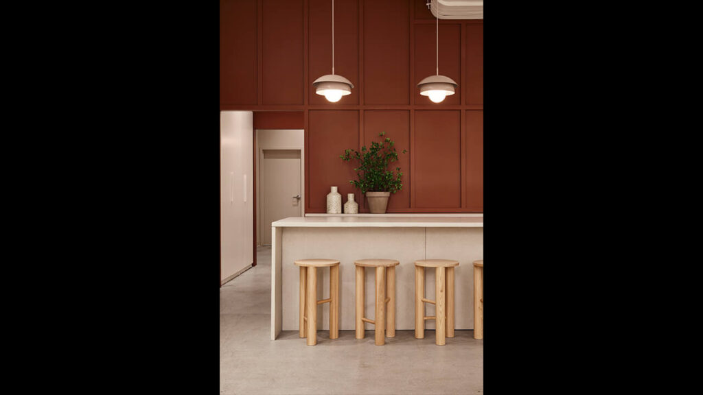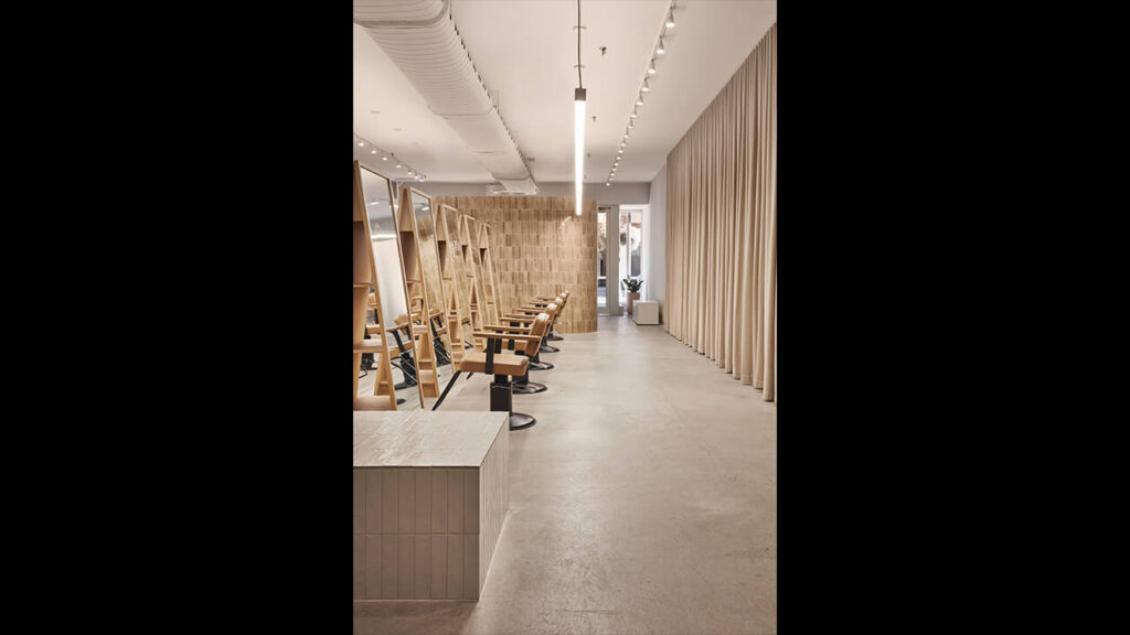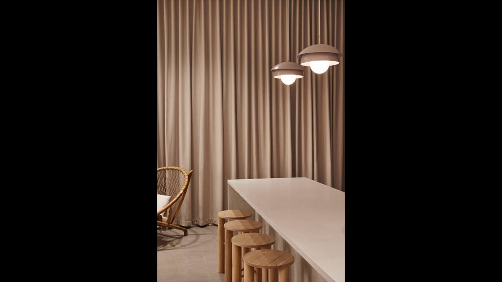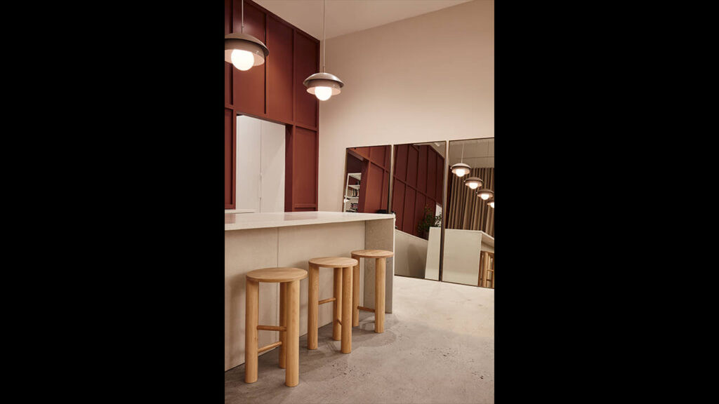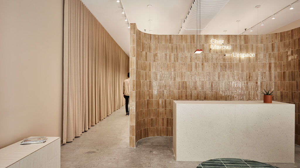 Dans l’intention de créer un espace convivial incarnant à la fois un salon, de même qu’un lieu de pause avant, pendant et après le rendez-vous, de multiples places habitées par des formes simples offrent des espaces appropriables tout en marquant différentes zones programmatiques propre à la vie de Chez Marcus – L’espace.