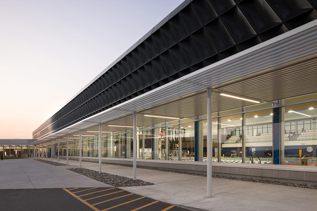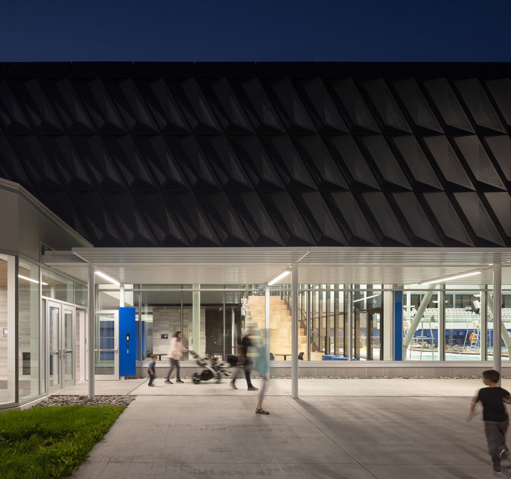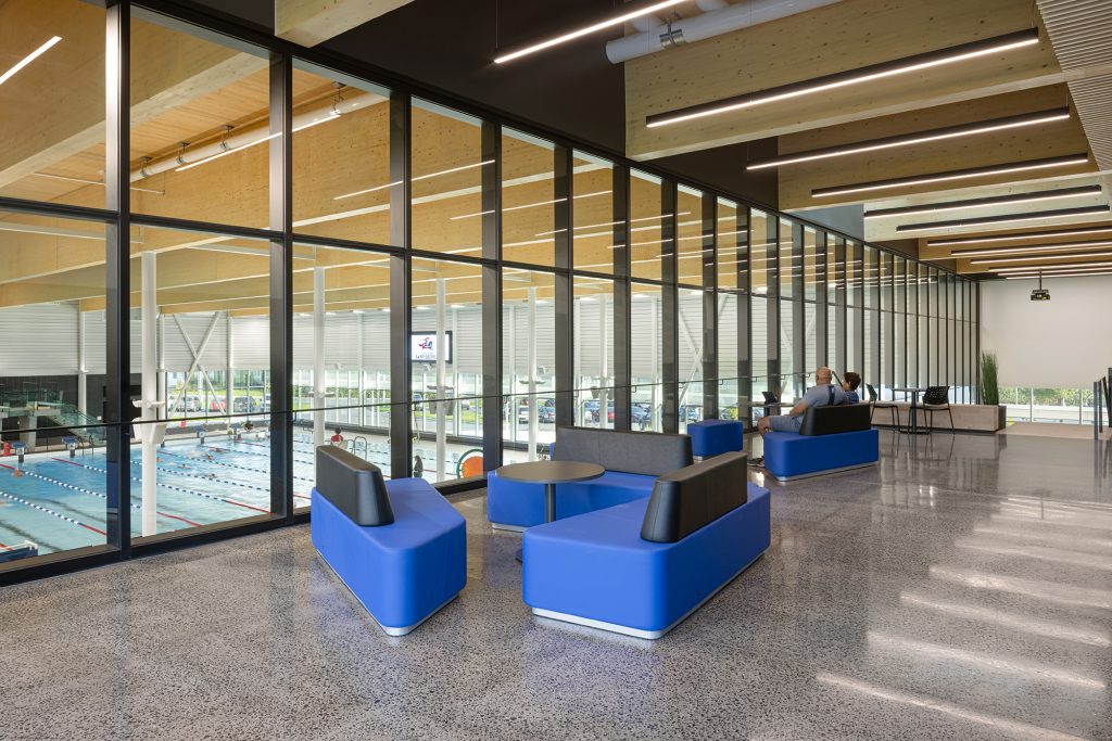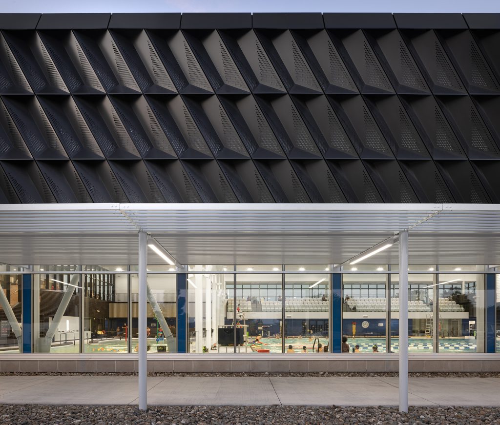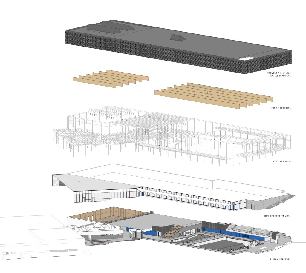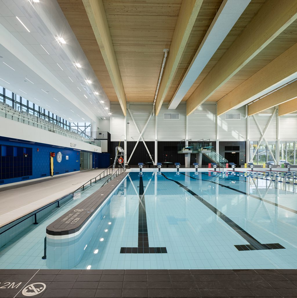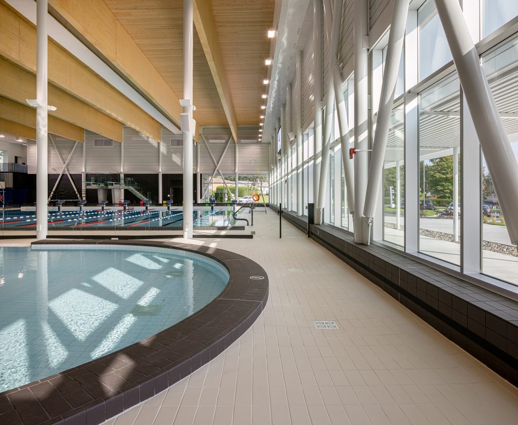 Dans le gymnase, de grandes ouvertures laissent généreusement pénétrer la lumière naturelle au nord, tandis qu’elle se trouve tamisée par les perforations dans le parement d’aluminium au sud. Composée d’un bassin sportif de 10 couloirs de 25 mètres avec des tremplins de 1 et 3 mètres, la zone aquatique comporte une rampe d’accès conçue pour les personnes à mobilité réduite et un bassin récréatif muni d’une entrée plage et de jeux d’eau. Abondamment vitré, l’espace est baigné de lumière naturelle. Du côté sud, un mur-rideau longe le parvis et une marquise atténue les rayons directs du soleil dans les bassins.