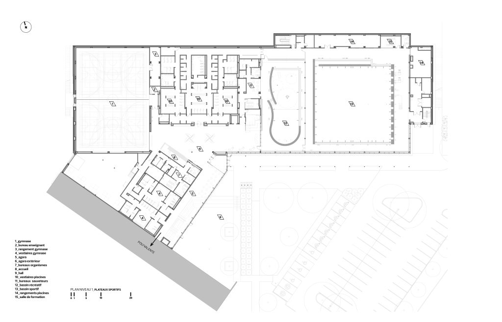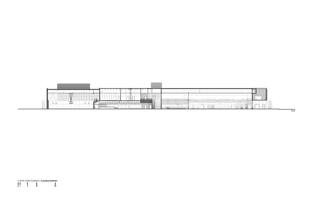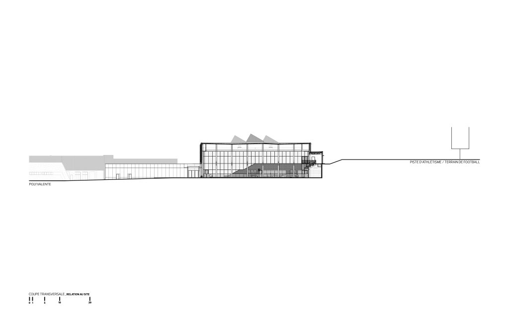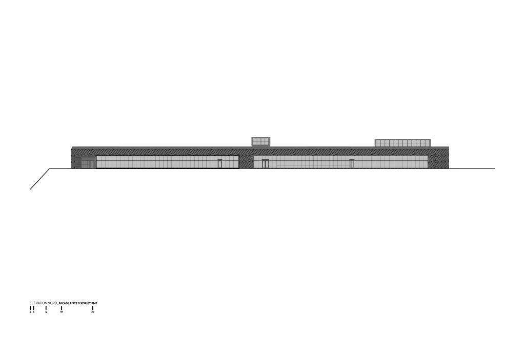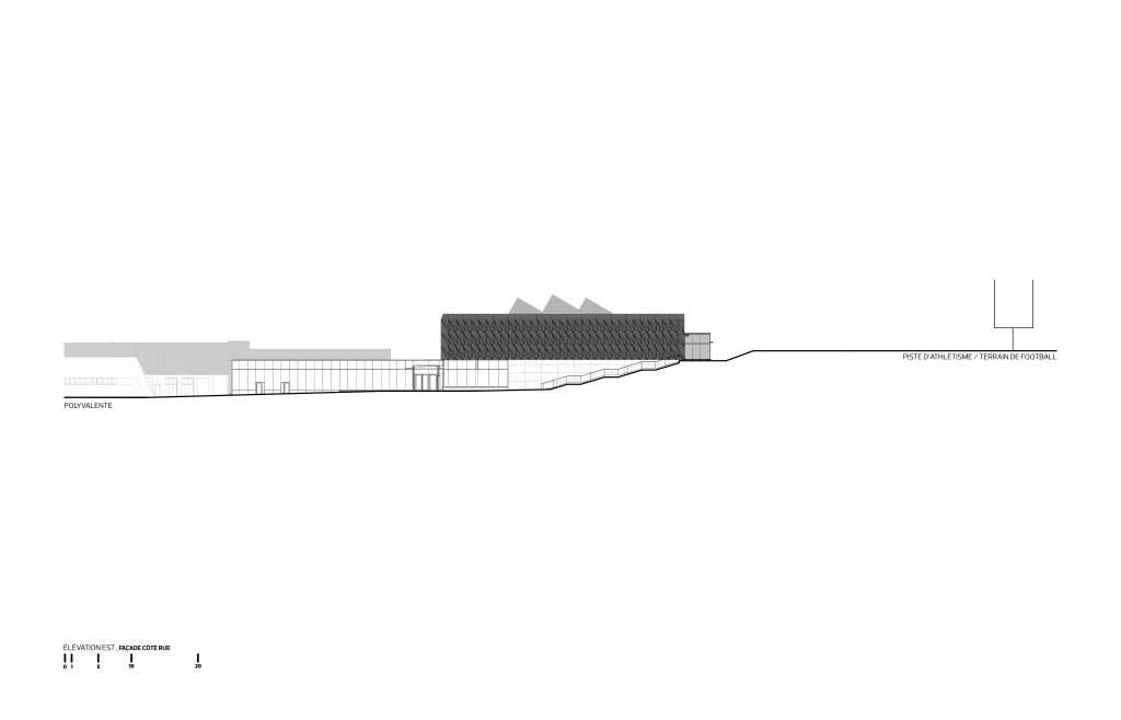 Le nouveau volume se déploie en longueur, parallèlement à la piste d’athlétisme extérieure, et se raccorde à la polyvalente au niveau du rez-de-chaussée. La topographie en pente du site a été exploitée afin d’offrir plusieurs accès de plain-pied et ainsi desservir toutes les clientèles, dont celles à mobilité réduite. Sur le flanc sud, les visiteurs sont invités à se diriger vers l’entrée principale en longeant un mur-rideau ouvert sur la piscine et protégé par une marquise.